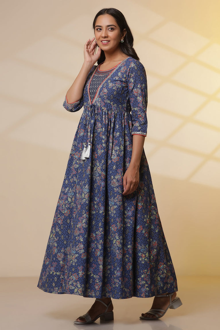 Blue Floral Printed Flared Kalidar Dress and Dupatta Set