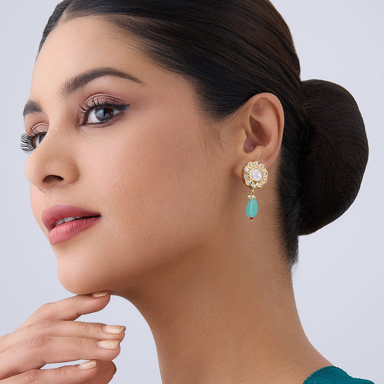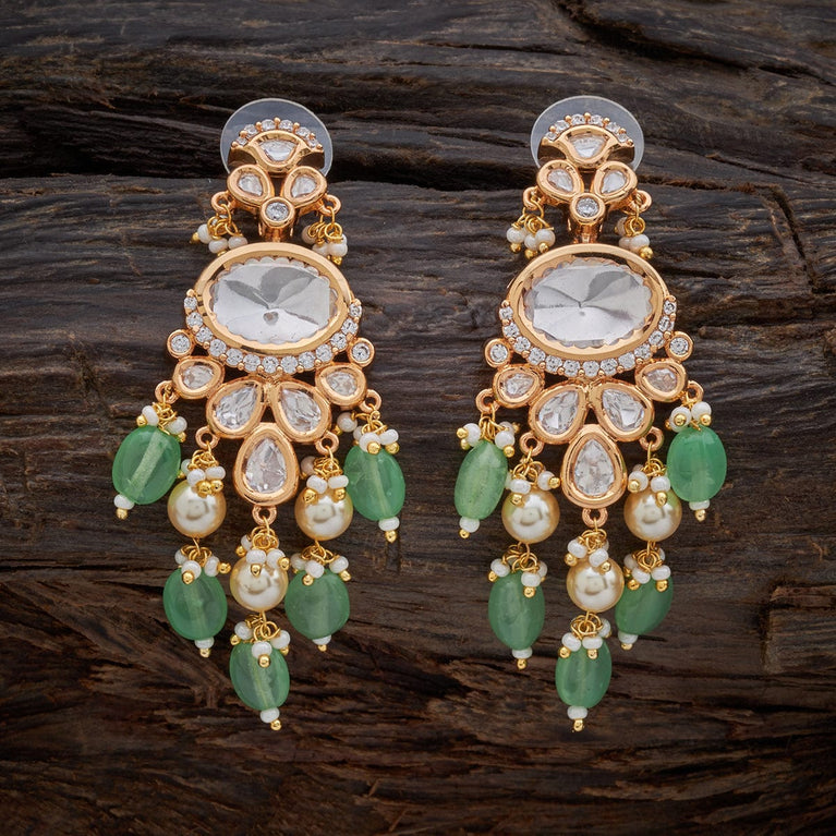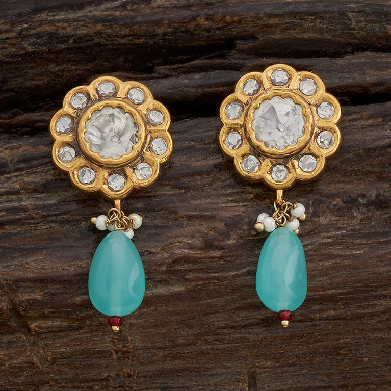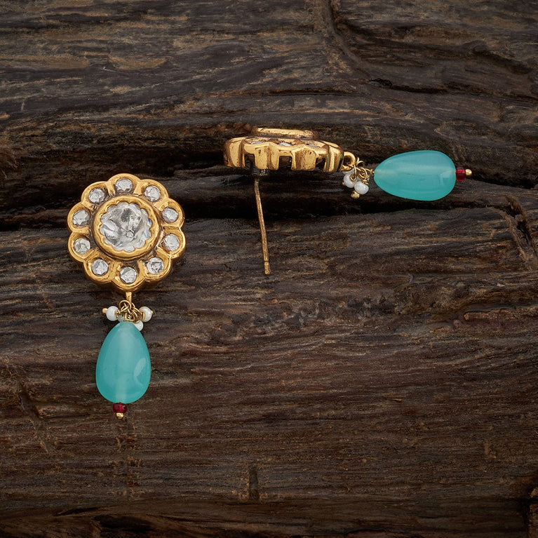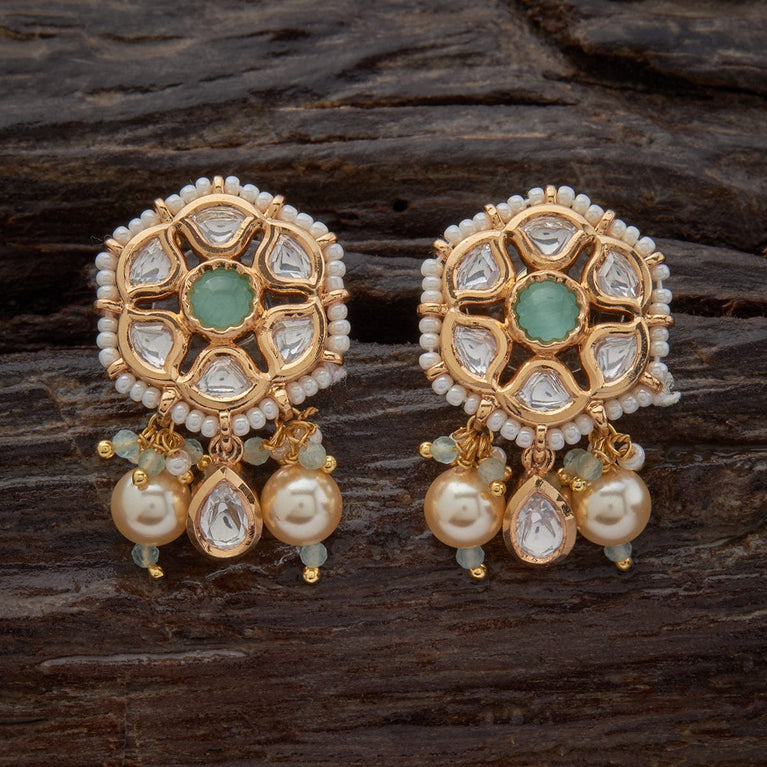 Kushal's Sea Green Kundan EarringElevate your glam quotient by wearing green Kundan earrings. These dazzling earrings are embellished with stonework. They are in the shape of flowers. These lovely accessories have a charming vibe and look adorable when paired with traditional or festive attire.