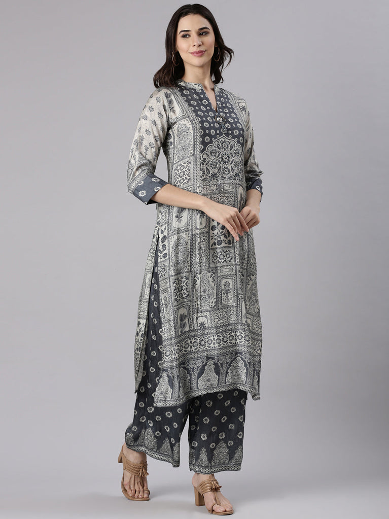 Gray Silk Ajrak Print Three Piece Set