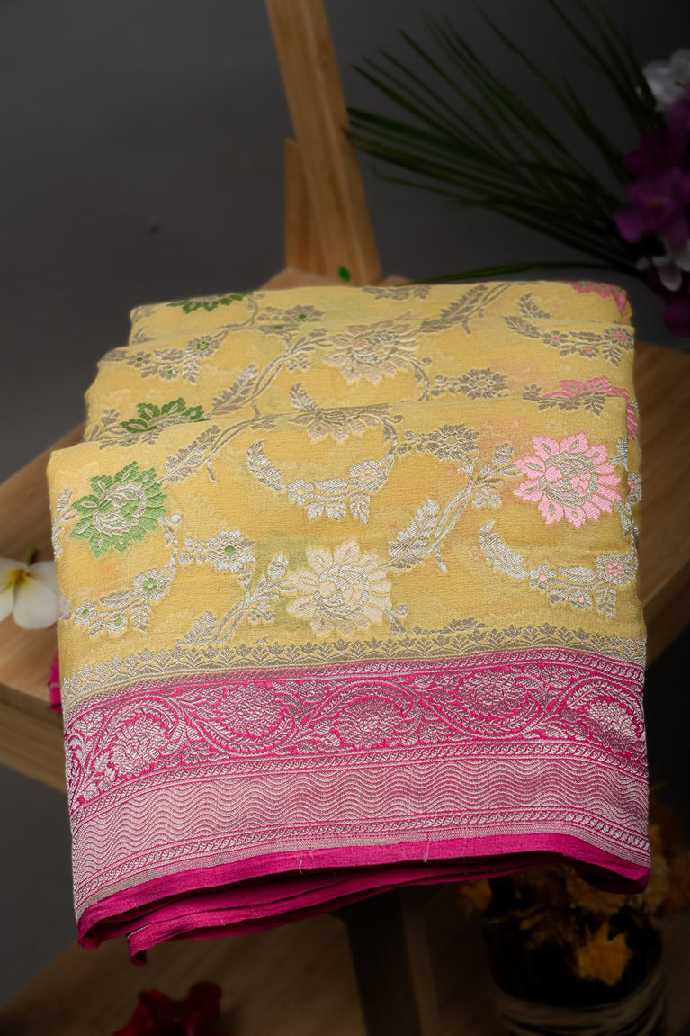 Mandir Lime Yellow & Blush Pink Banarasi Florals Saree