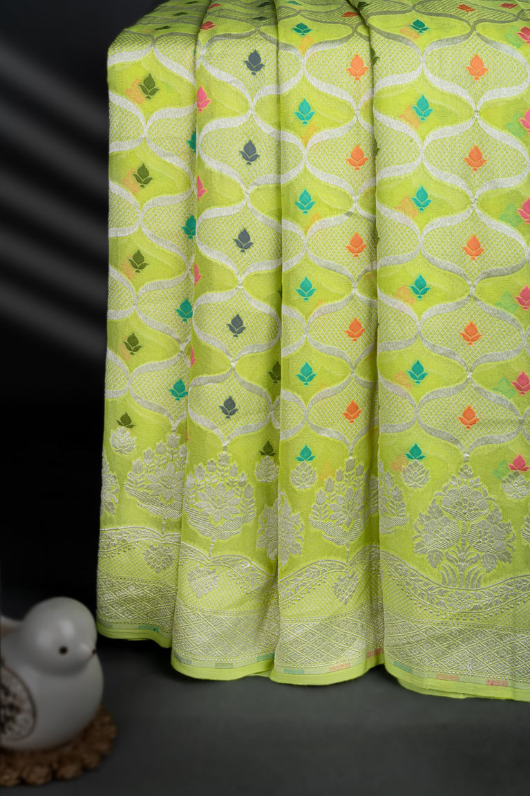 Mandir Lime Green & Gold Banarasi Jaal Saree