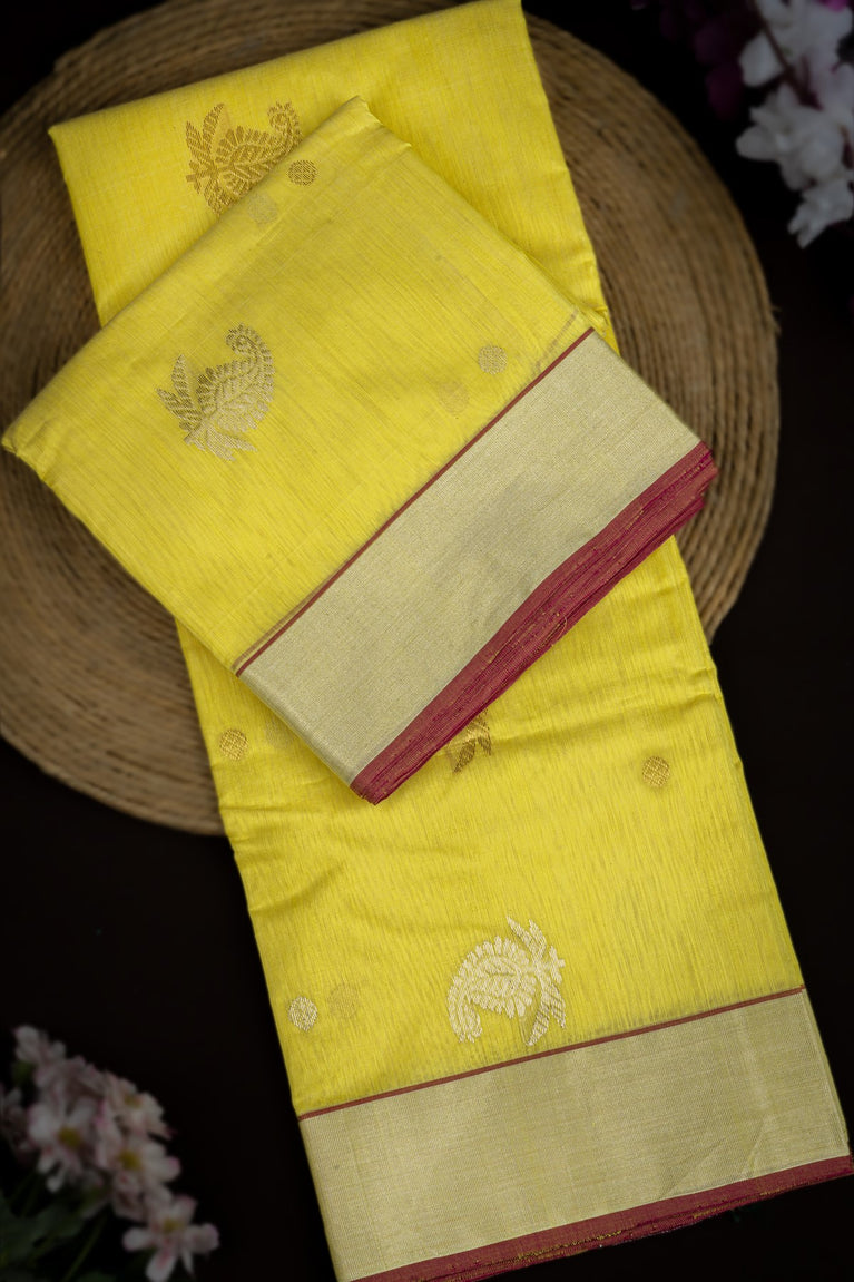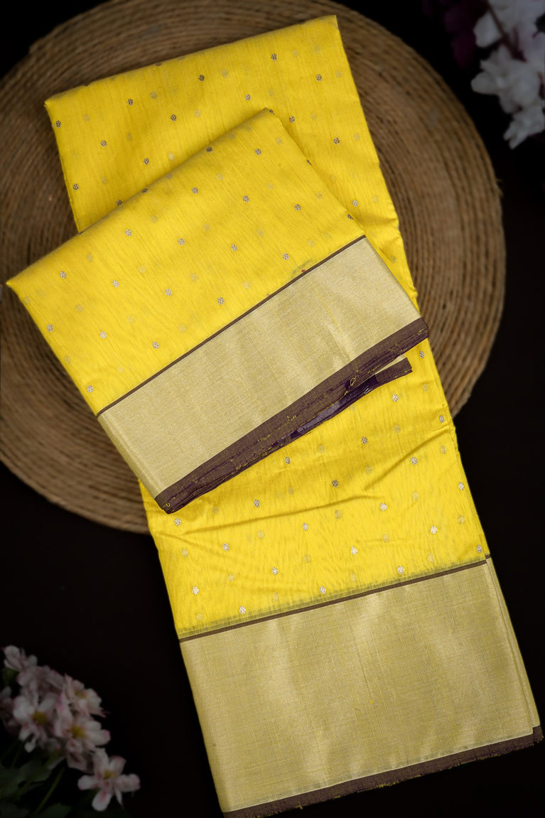 Mandir Lime Yellow & Light Brown Venkatagiri Checks And Buttis Saree