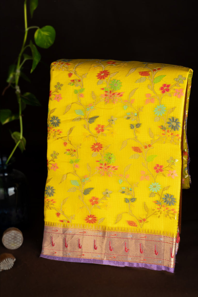 Mandir Lime Yellow & Lavender Fancy Floral Jaal Saree