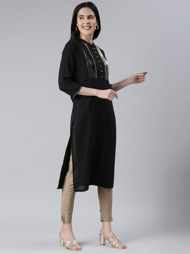 Neeru's Black Regular Straight Embroidered Kurtas This Flirty Kurta Is Perfect For Sprucing Up Your Warm-Weather Wardrobe. Add A Bit Of Boho Vibes To Your Look With The Embroidered Details And Flirty Silhouette!