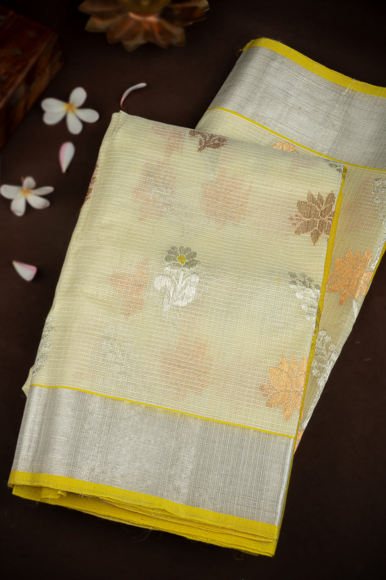 Varamahalakshmi Cream & Lime Yellow Zari Kota Jaal Saree