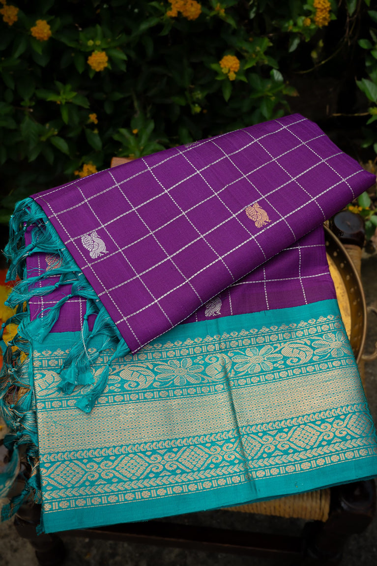 Varamahalakshmi Purple & Sea Green Kuppadam Checks And Buttis Saree