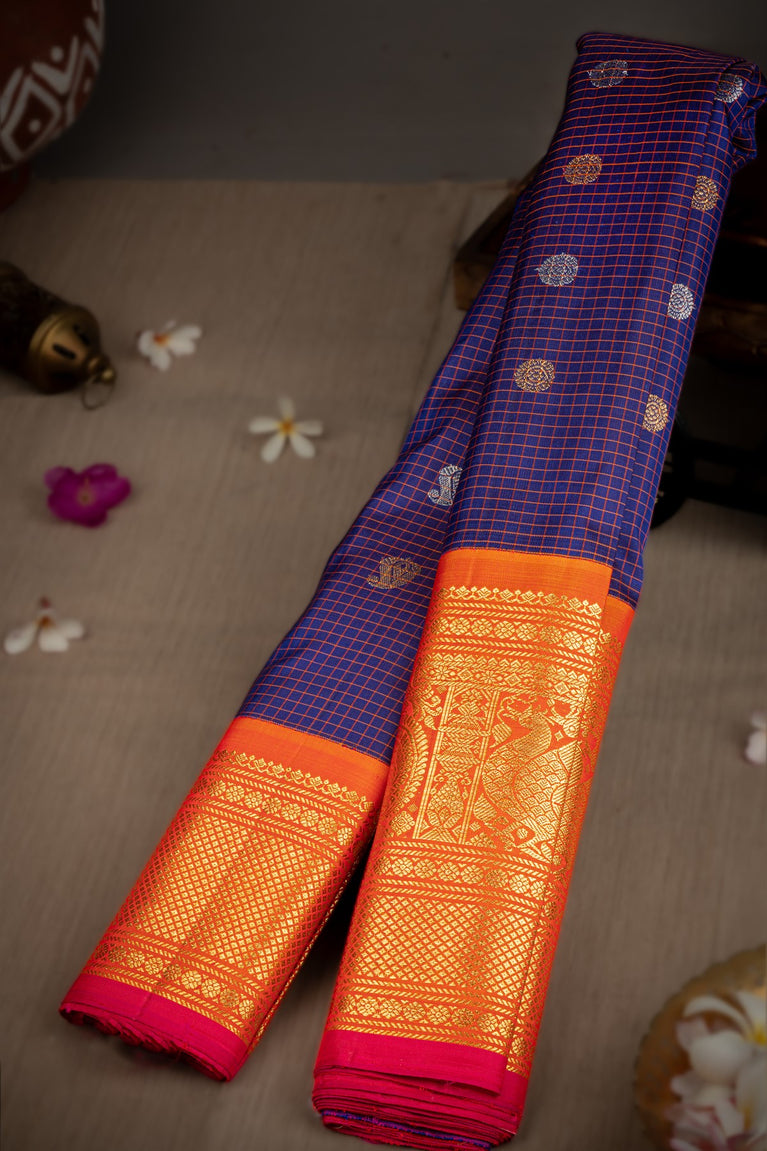 Varamahalakshmi Royal Blue & Orange Gadwal Checks And Buttis Saree