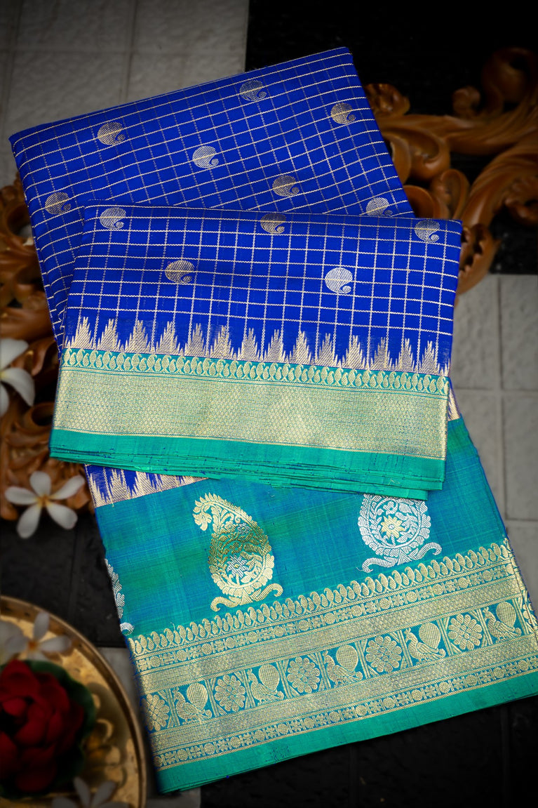 Varamahalakshmi Royal Blue & Sea Green Venkatagiri Checks And Buttis Saree