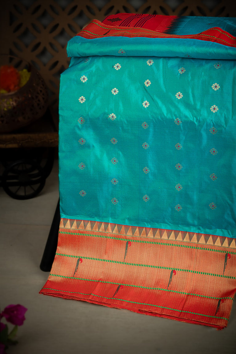 Varamahalakshmi Teal Blue & Gold and Red Paithani Buttis Saree