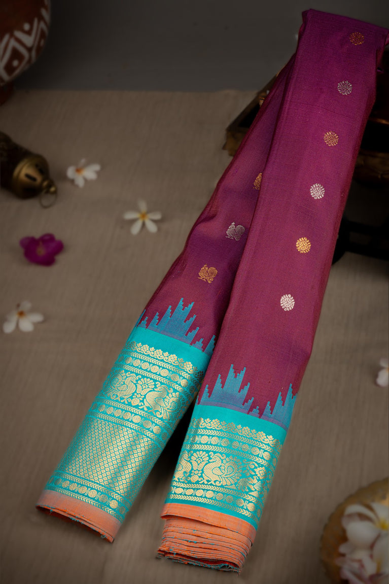 Varamahalakshmi Wine & Sea Blue Gadwal Buttis Saree