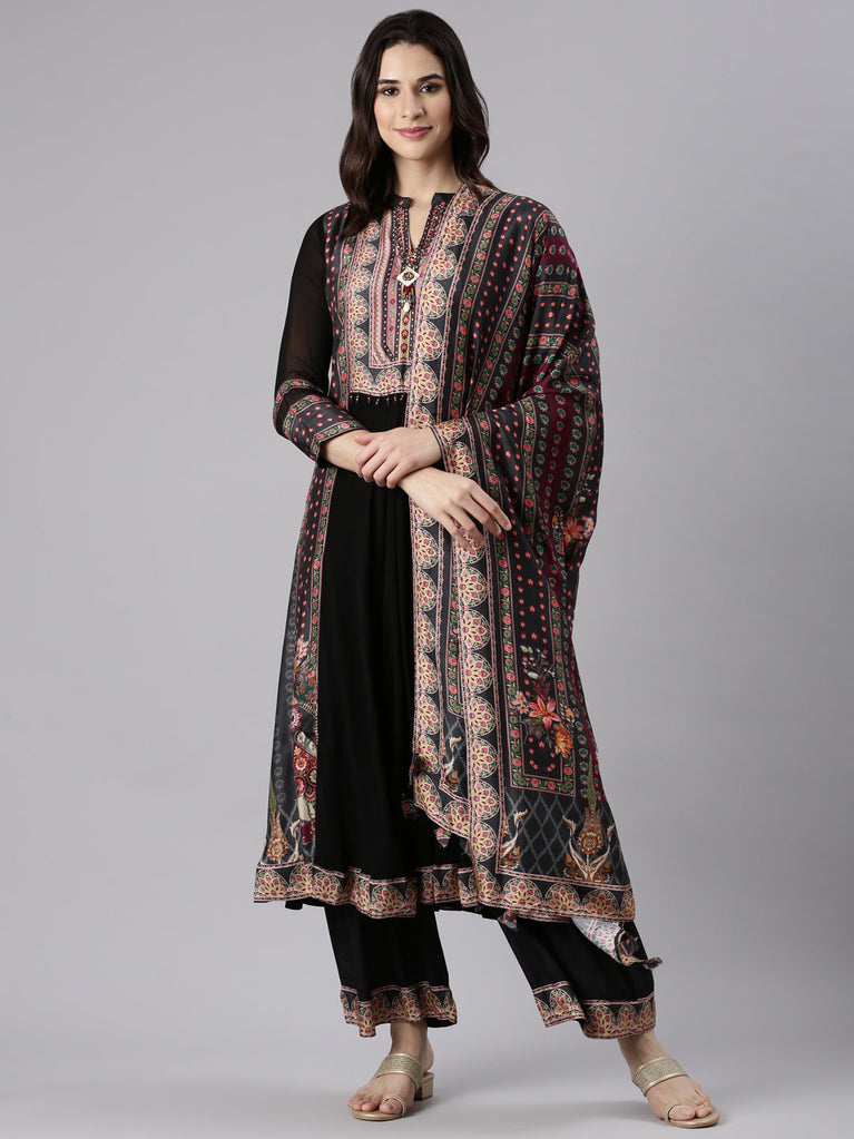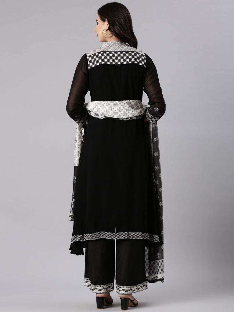 Elevate your ethnic wardrobe with this Black Georgette Anarkali Three Piece Set. Crafted from flowing georgette fabric, it offers a graceful silhouette and comfortable fit. The set combines traditional elegance with modern design, perfect for festive occasions or special gatherings. Its timeless black hue adds a touch of sophistication, ensuring you stand out with effortless charm.
