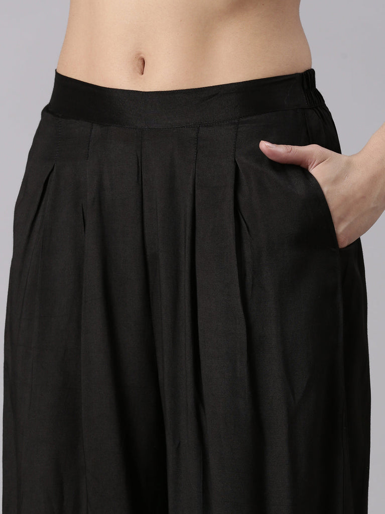 This elegant black peplum top, richly hand embroidered, pairs beautifully with a matching palazzo set, creating a graceful ensemble for any special occasion. The detailed craftsmanship adds a touch of sophistication, while the comfortable fit ensures ease of wear throughout your day. Perfect for making a stylish statement with confidence and comfort.