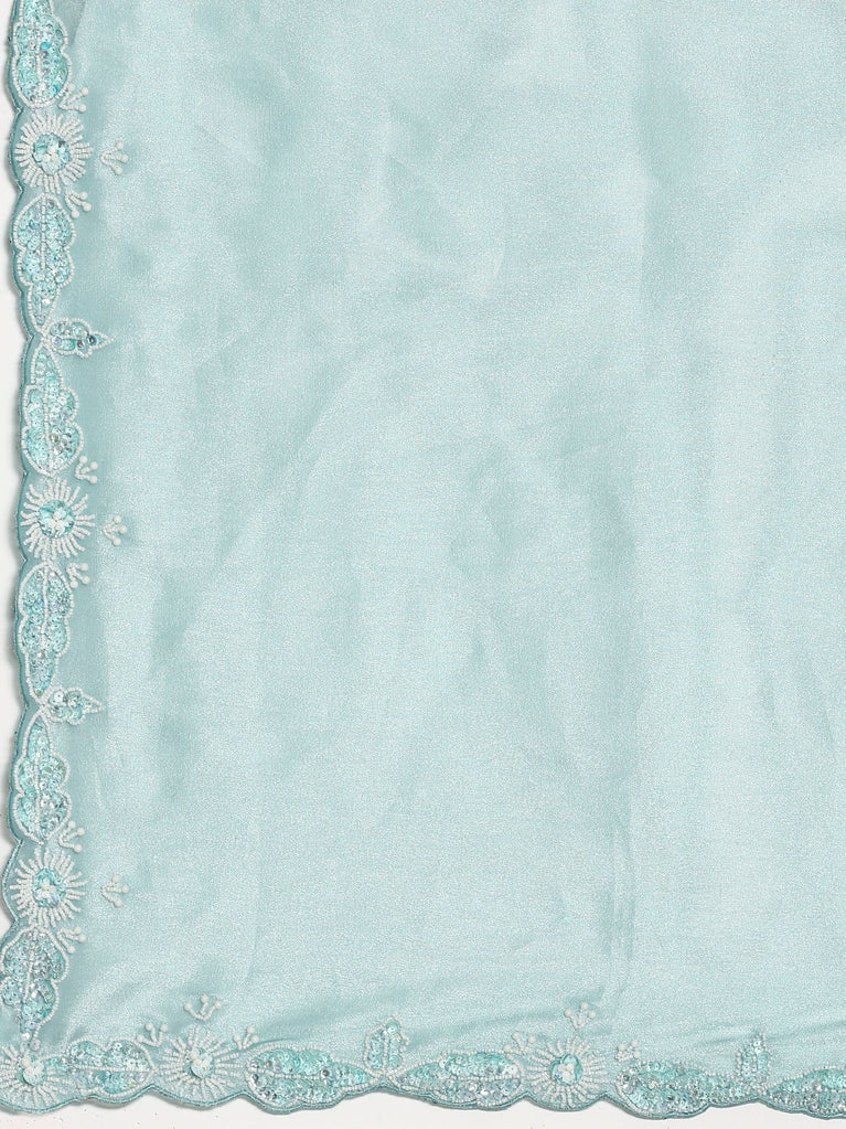 Blue Jimmy satin tissue saree work pearls & sequins embroidery with ready made blouse