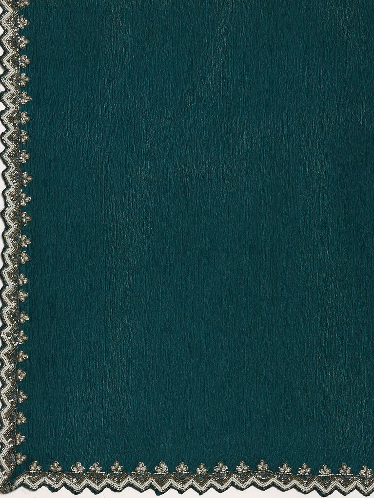 This elegant bottle green Jimmy saree features intricate cut Dana and pearl embroidery, enhancing its rich texture and adding a refined touch. Paired with a ready-made blouse, this ensemble combines traditional craftsmanship with modern convenience, making it perfect for festive occasions or formal events. The detailed embroidery highlights the saree's luxurious appeal while offering effortless style.