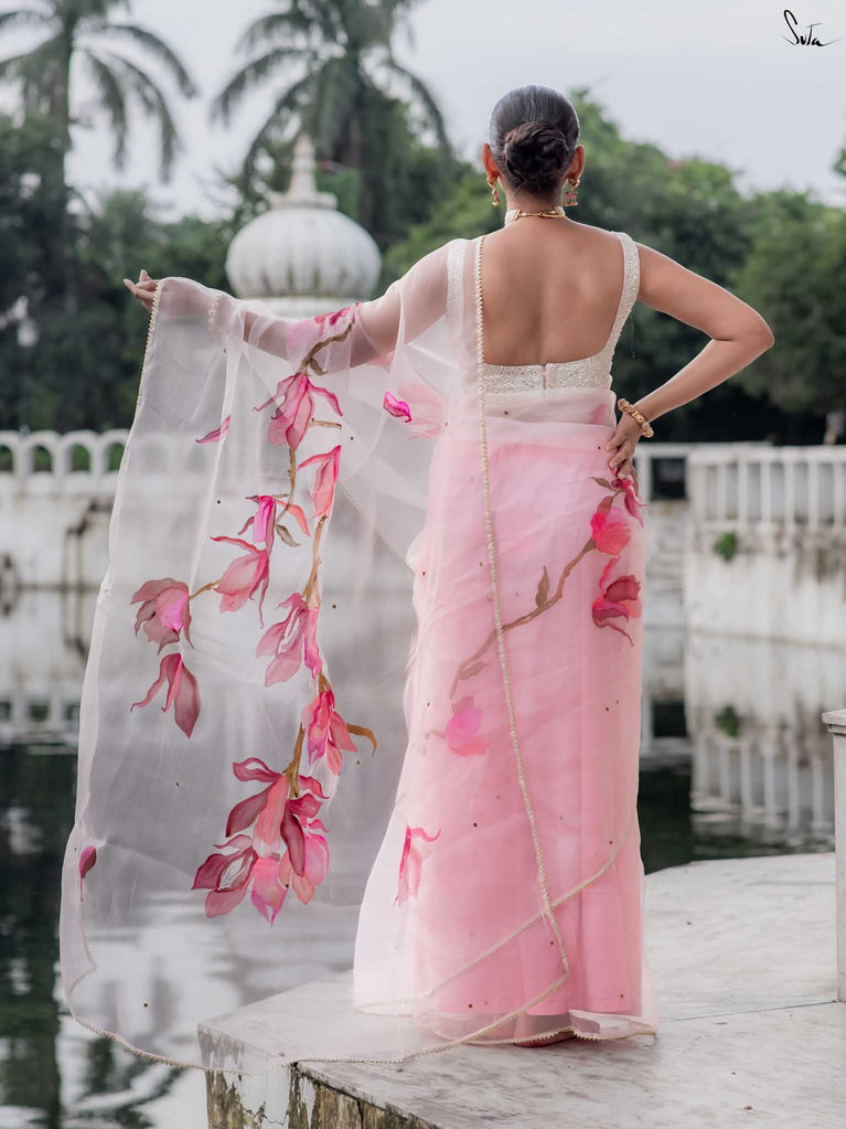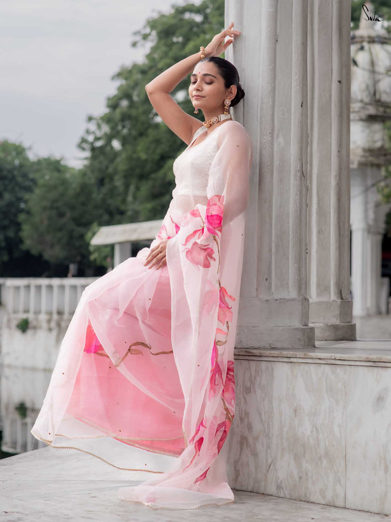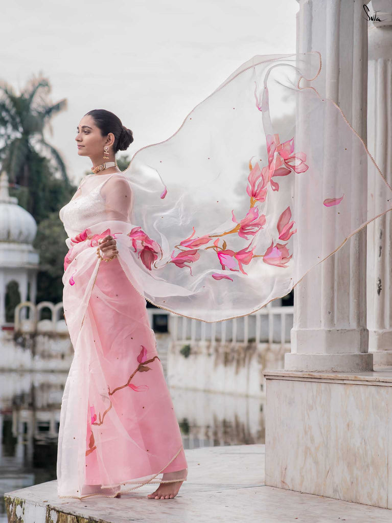 Light as air and translucent like a rainbow, organza silk is a fabric that exudes delicate grandeur. Woven with twisted silk yarn on the warp as well as the weft, this fabric is hailed for its slight transparency and its slightly stiff and yet fluid texture. The slight sheen adds to its charisma, making it the perfect saree to drape for both festive and formal occasions.