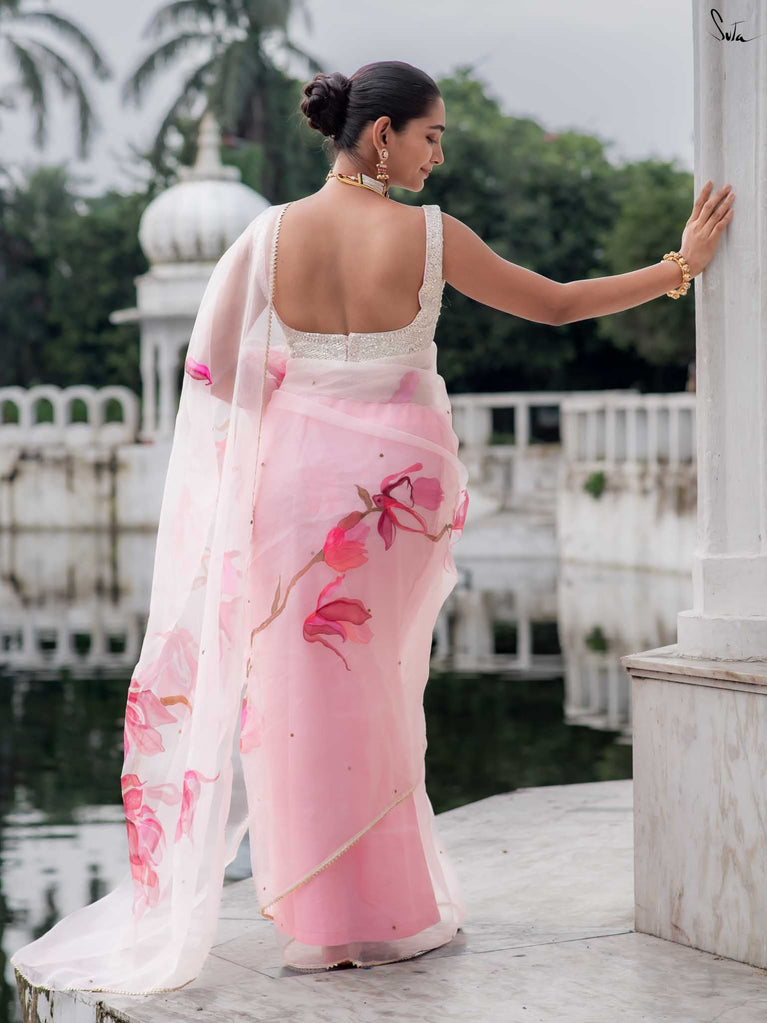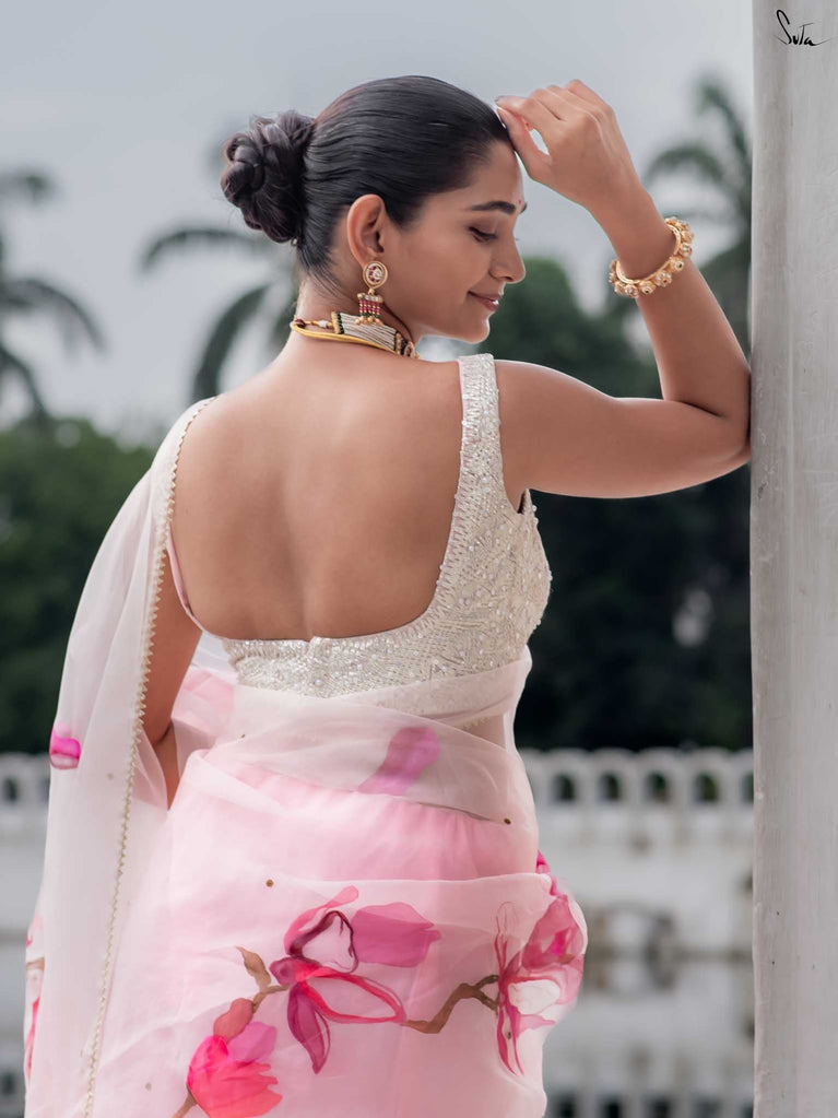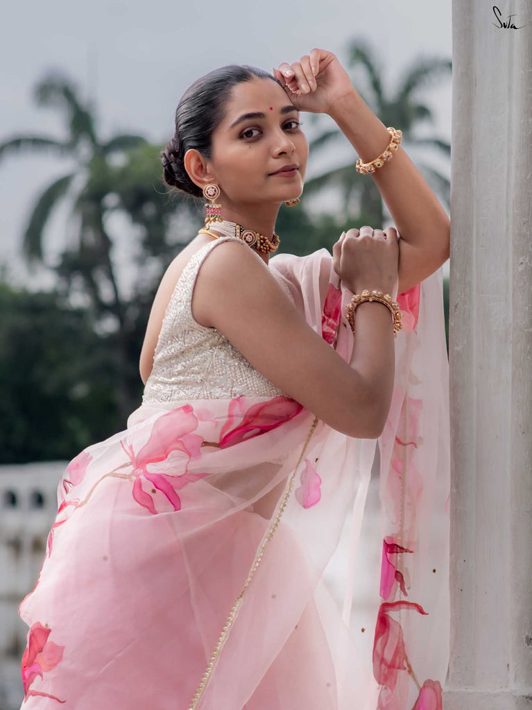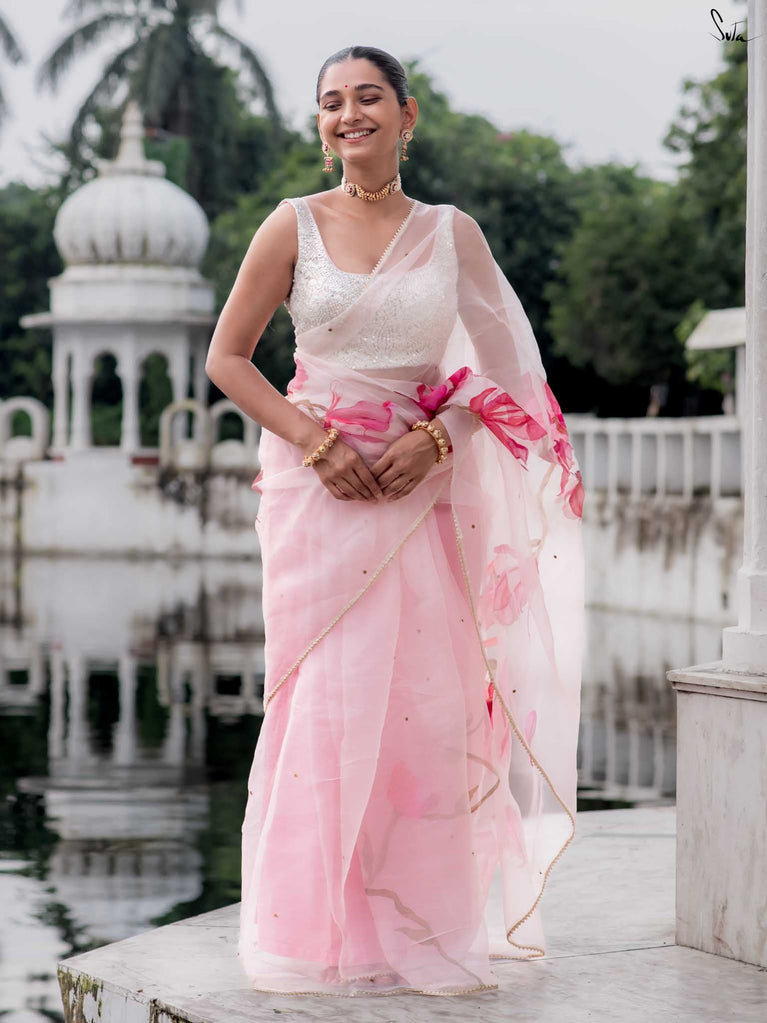 The model is wearing size S blouse and the saree is Shaadi Hai