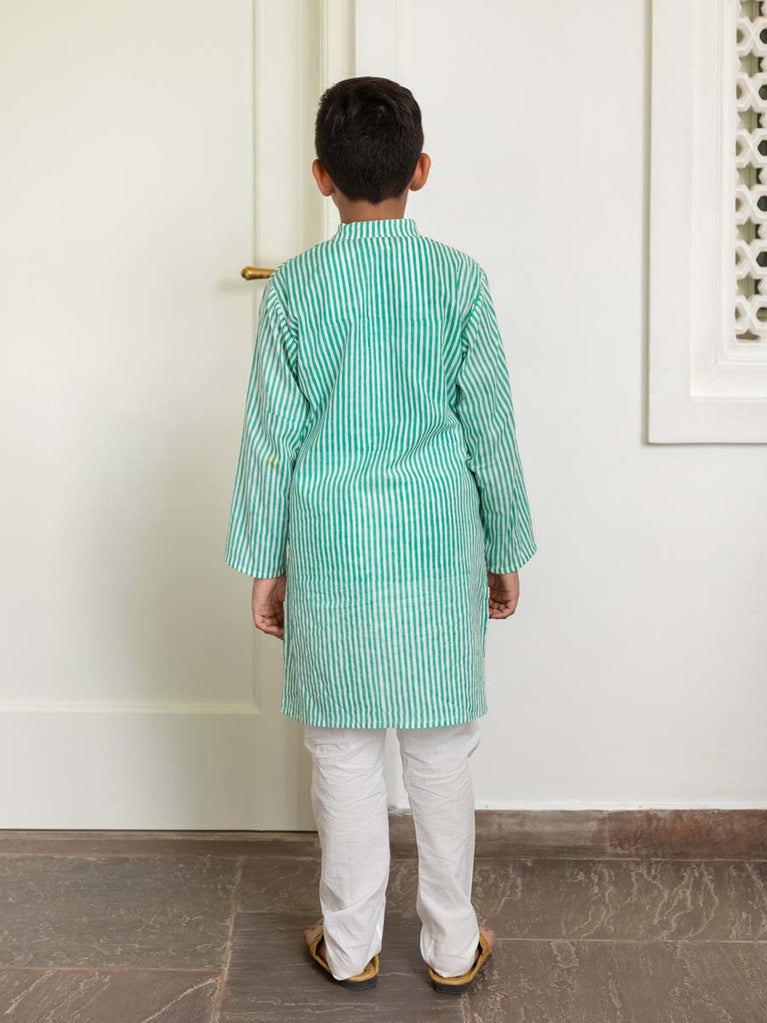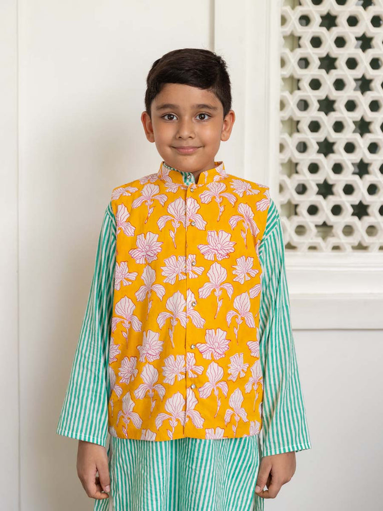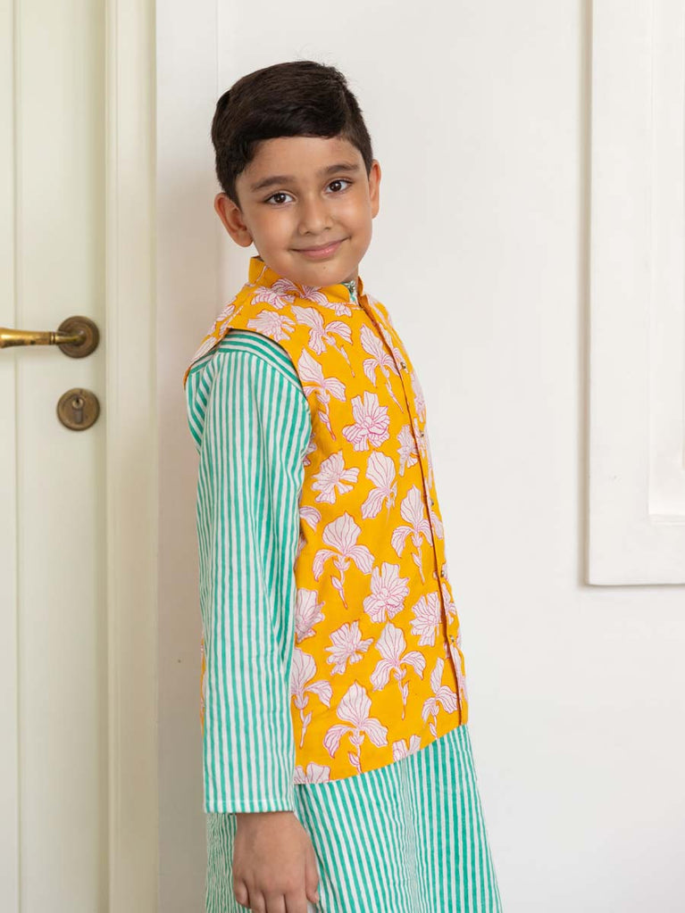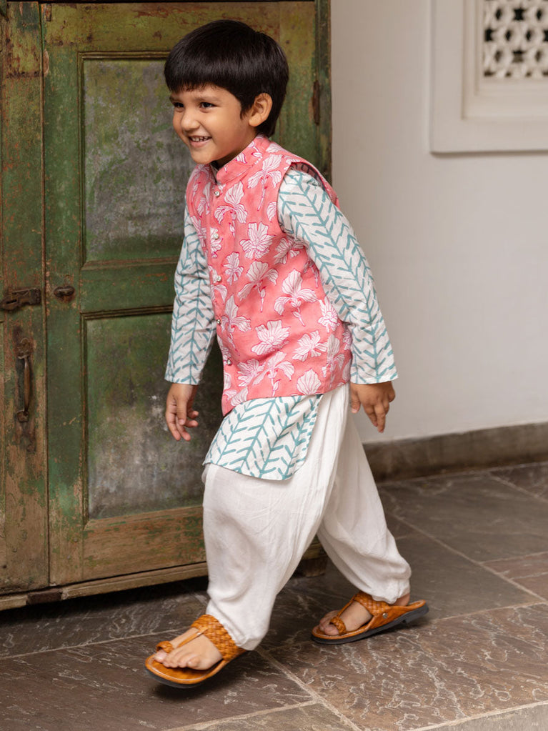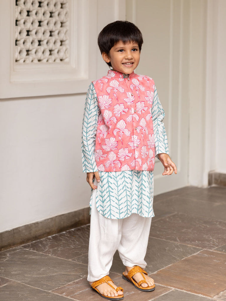 Set of 3 - Kanha Organic Cotton Block Printed Long Kurta with Jacket