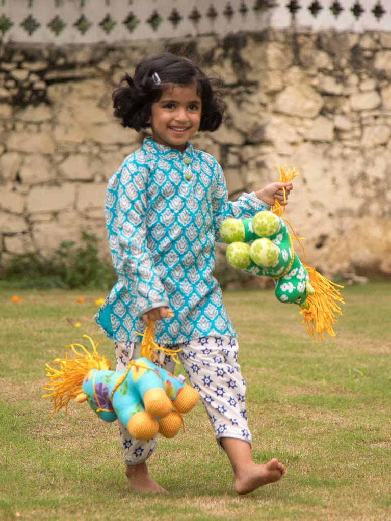 Set of 3 - Blue Sky Block Printed Kurta With Jacket