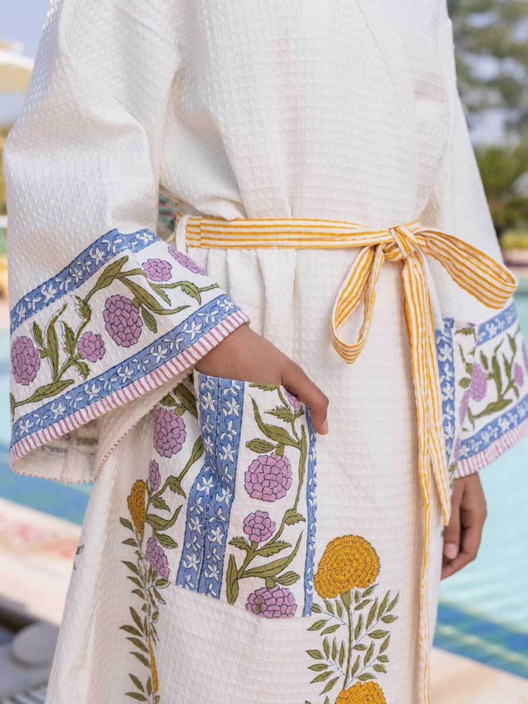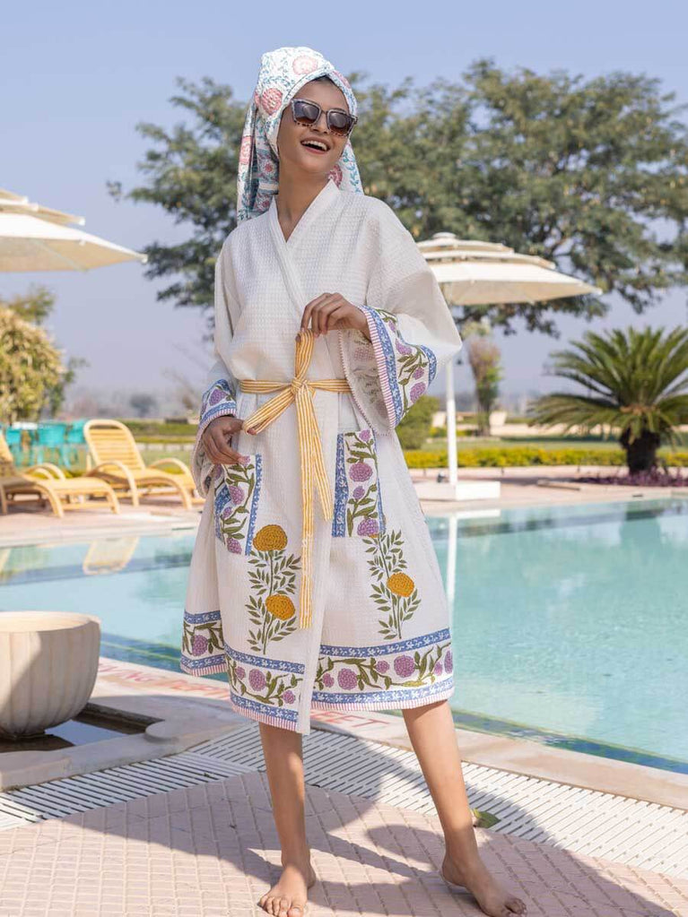 Utsa Waffle Block Printed Cotton Bath Robe