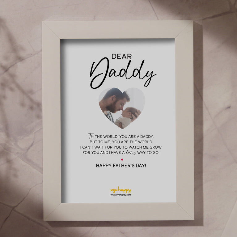 The frame holds a sweet message from the baby and is customisable with a cute photo of the baby and it's daddy. It isn’t just a frame. It's the baby's way of saying “I love you, Dad!Place it on a table, shelf, or hang it on the wall. It will be like a daily dose of love from the little one.Specifications: Size of the Frame - 17.5 x 12.5 cms
