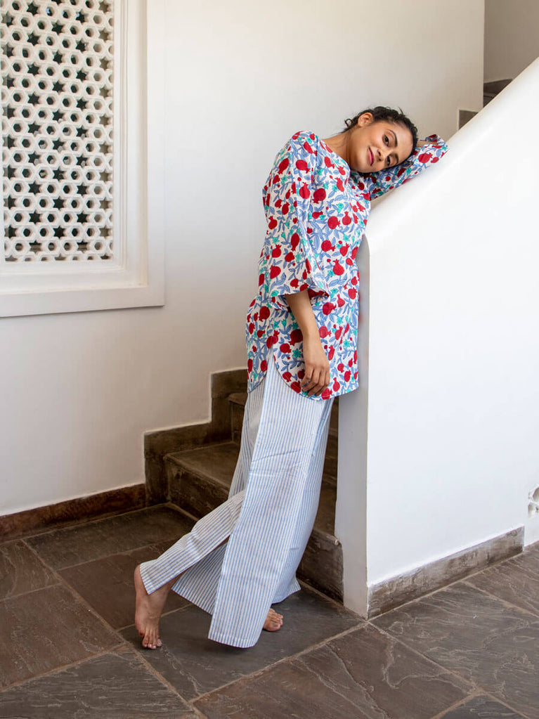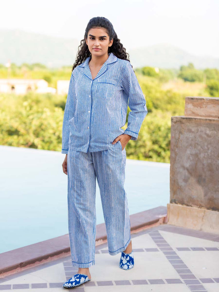 Blue Stripes Block Printed Cotton Top & Pyjama Set