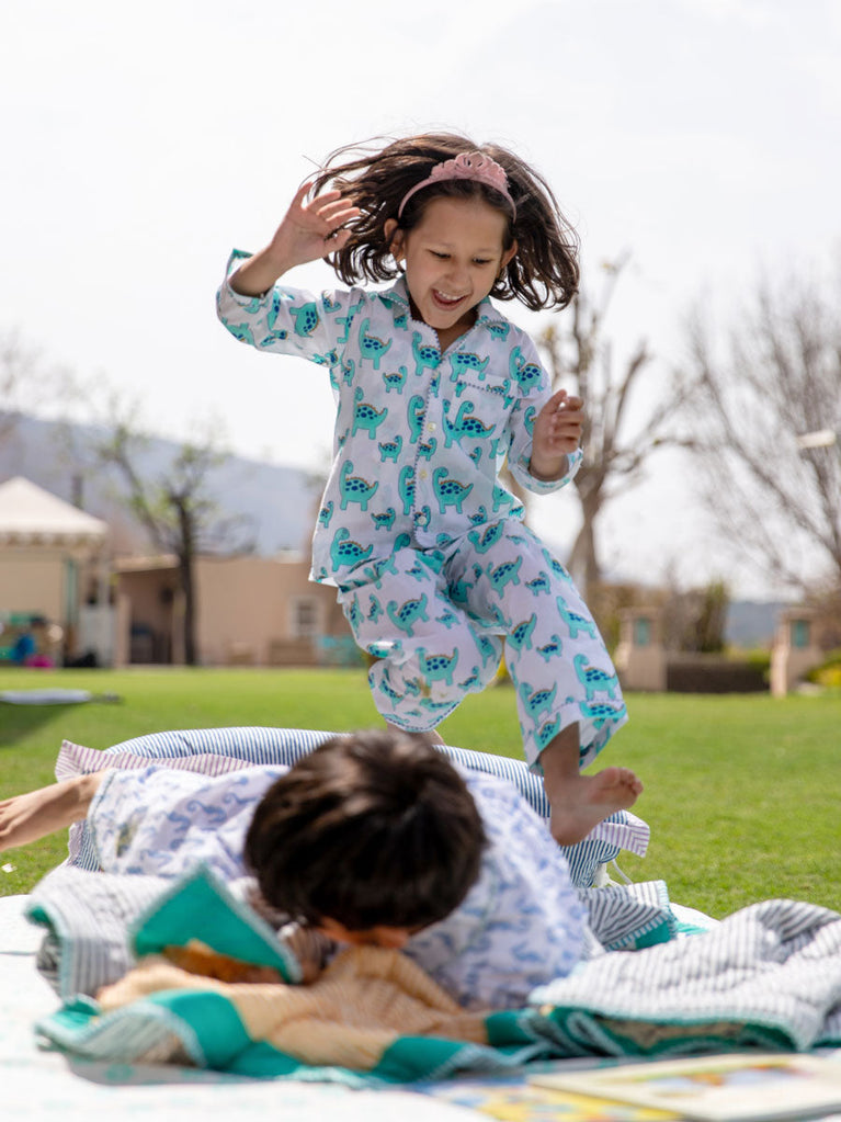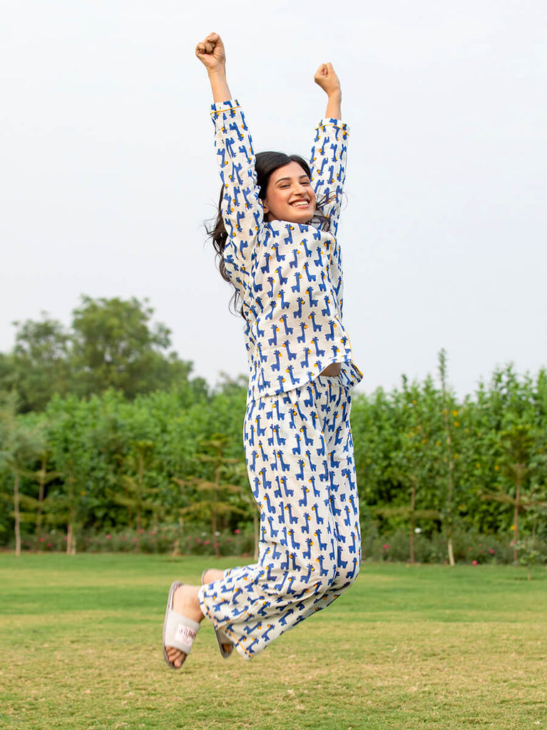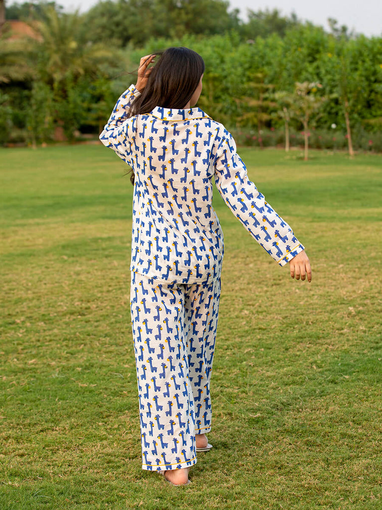 Blue Giraffe Block Printed Cotton Top & Pyjama Set