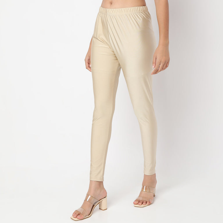 Beige Solid Skinny Fit Cotton Tights With Elasticated Waist