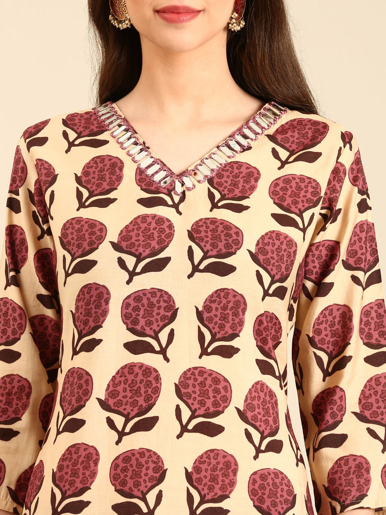 Maroon Cotton Print With Embroidery Three Piece Suit Set
