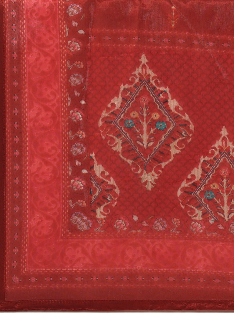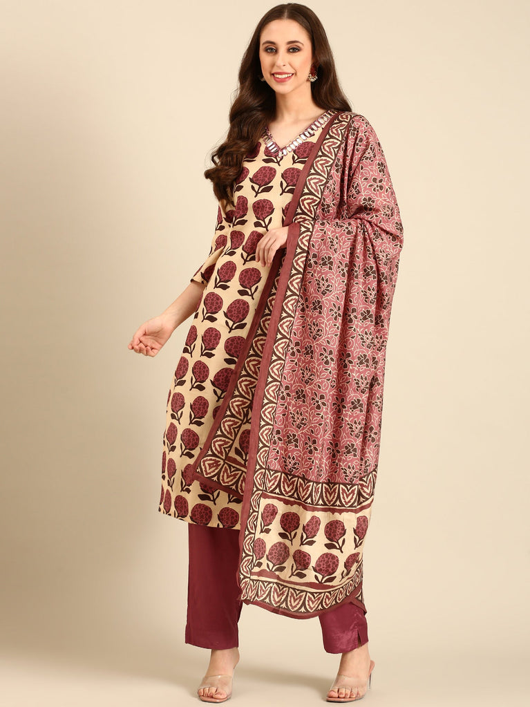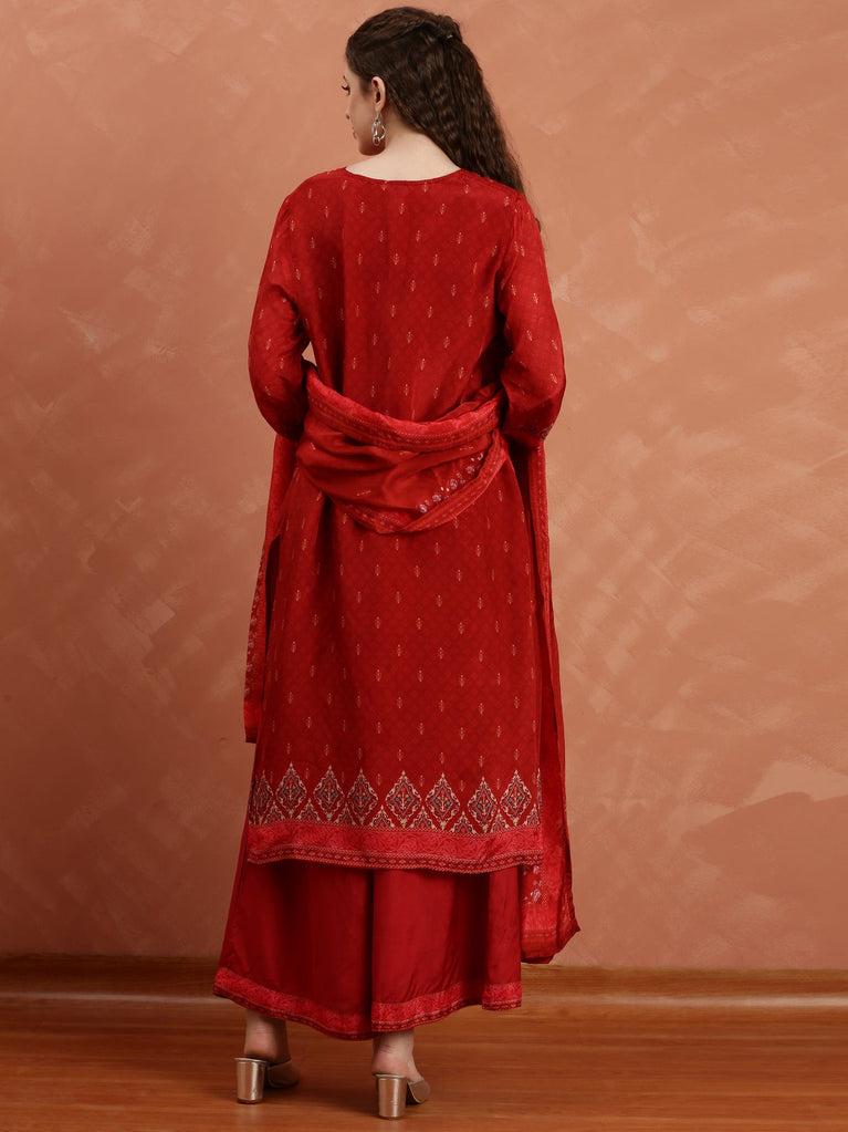 Maroon Crepe Printed Three Piece Suit Set