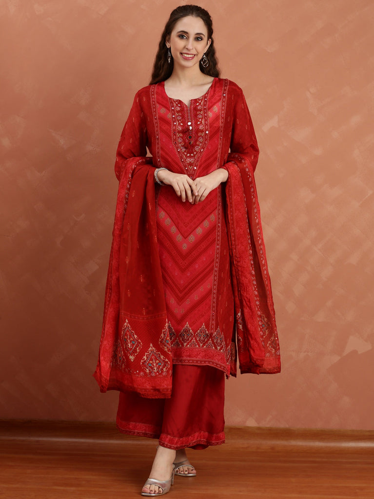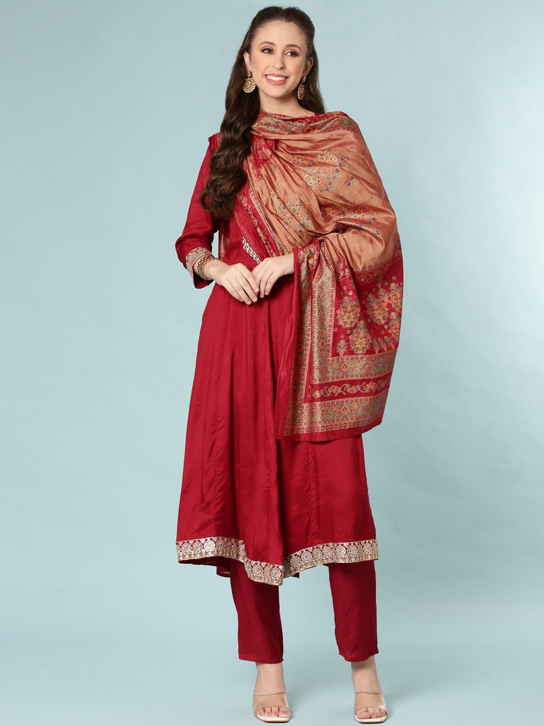Maroon Dola Silk Three Piece Set