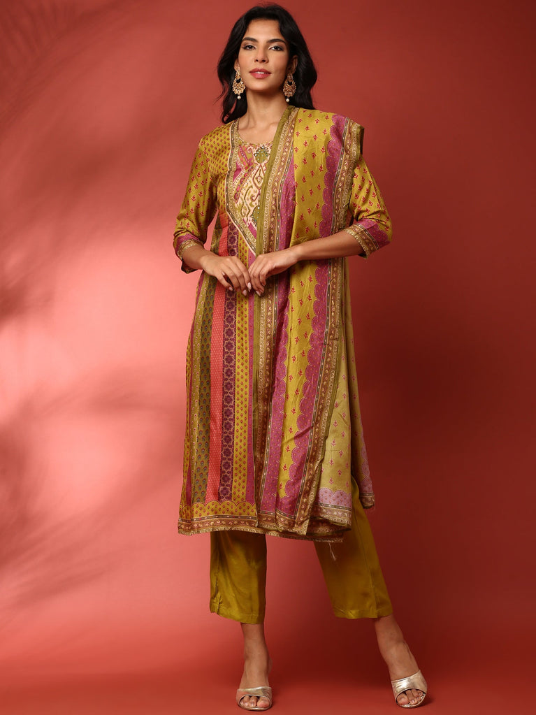 Mustard and green striped silk embroidered anarkali set