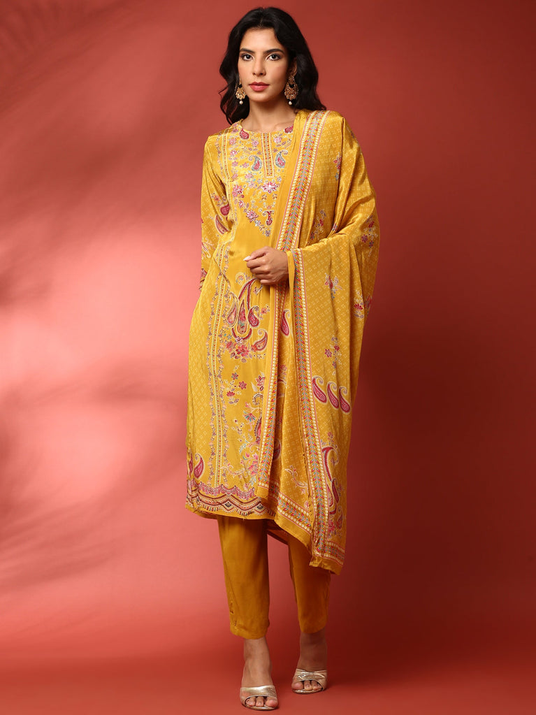 Mustard Dola Silk Floral Digital Print Three Piece Set