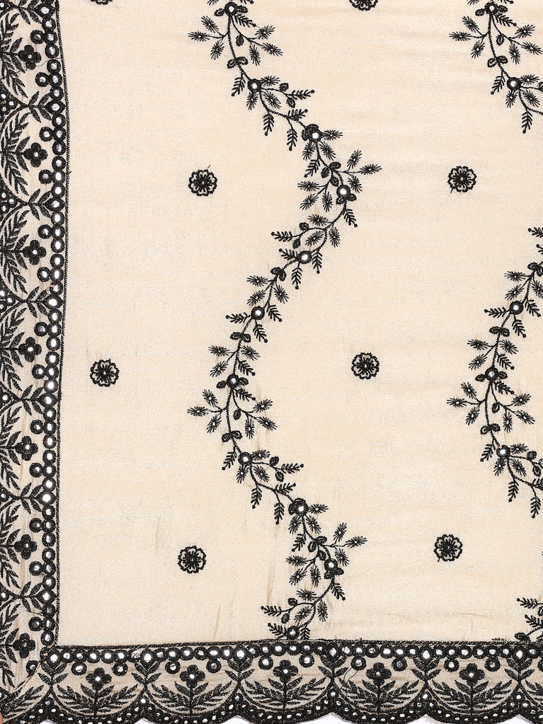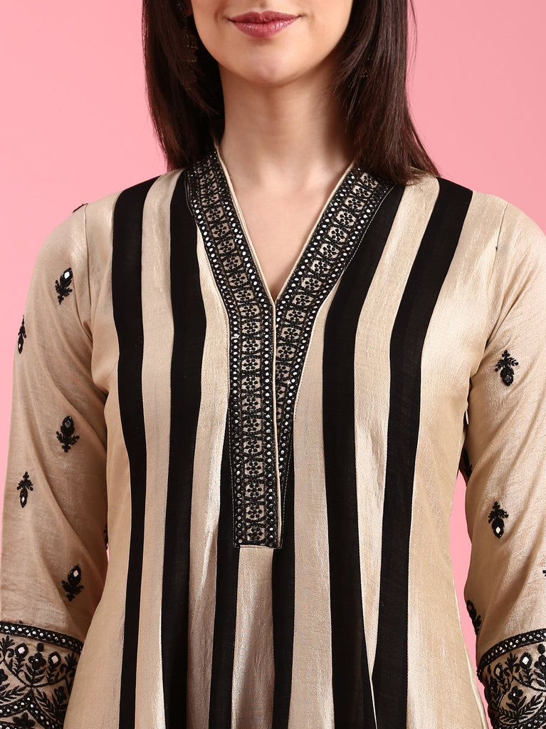 This elegant three-piece suit set features a black and cream printed design enhanced with gold zari embroidery for a subtle yet striking look. Crafted from soft black modal fabric, the anarkali suit includes a delicately embroidered neck and dhaman sleeves adorned with gold zari laces and sequins, adding a refined shimmer.