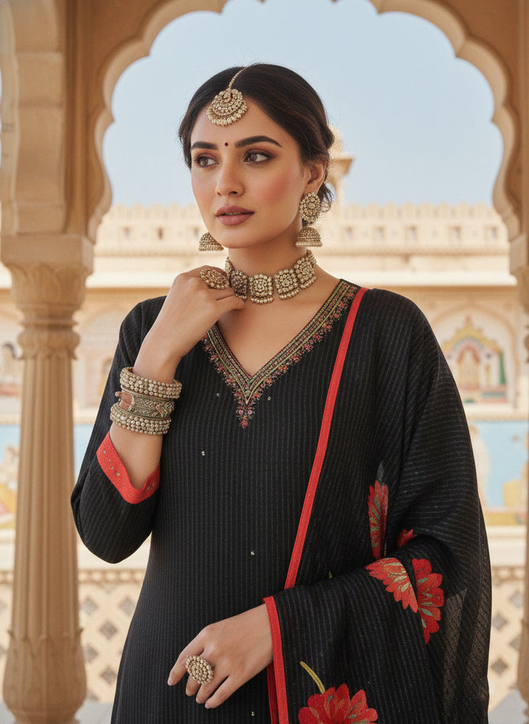 Embrace timeless elegance with this stunning black muslin three-piece set, featuring delicate floral prints that add a touch of sophistication to your wardrobe. Crafted from breathable muslin fabric, this versatile ensemble offers comfort and style for any occasion. The coordinated pieces work beautifully together or separately, giving you endless styling possibilities. Perfect for casual outings, festive gatherings, or everyday wear, this set combines traditional charm with contemporary design. Celebrate your personal style with a piece that's both comfortable and effortlessly chic.