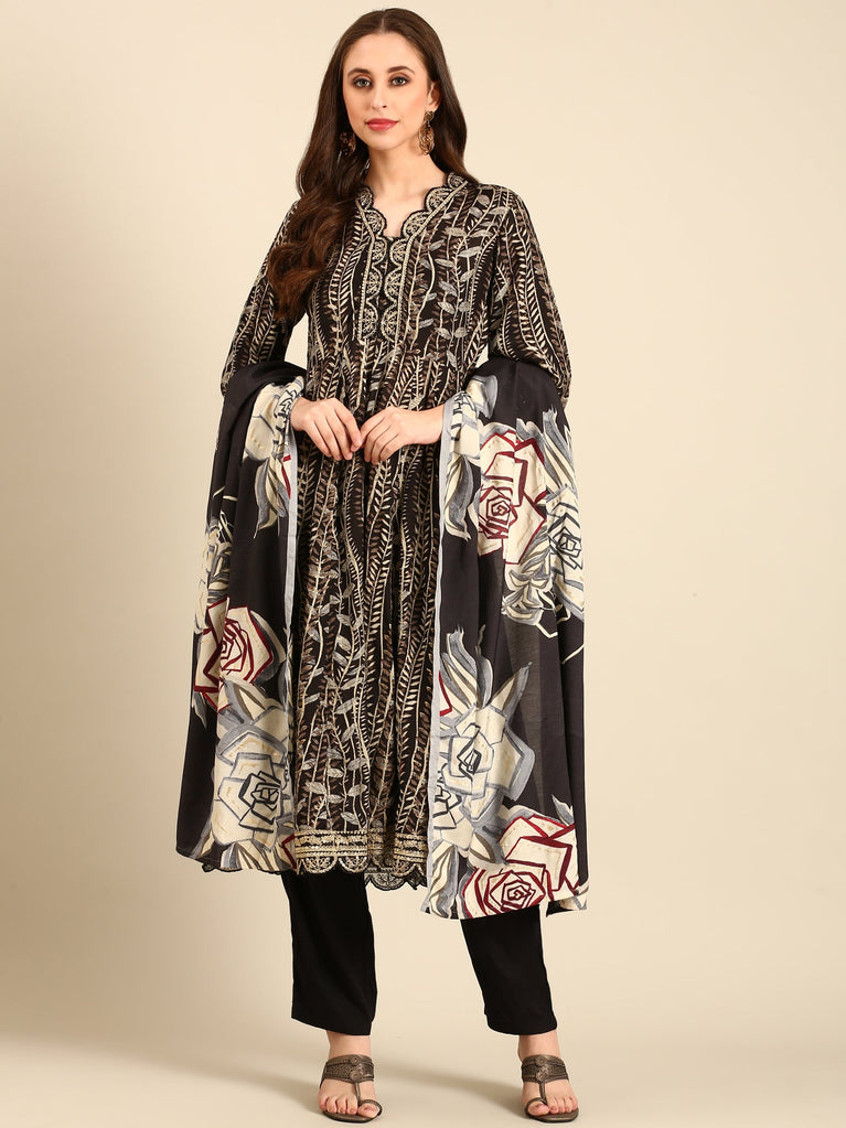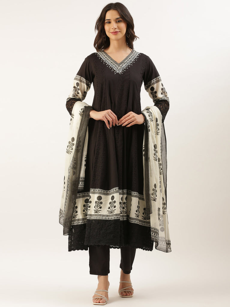 Black Chikan Anarkali Three Piece Suit Set