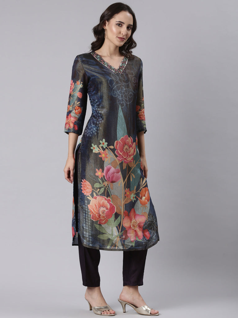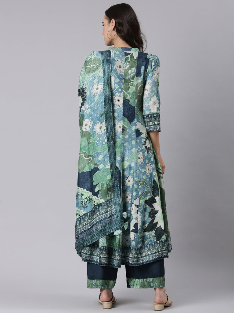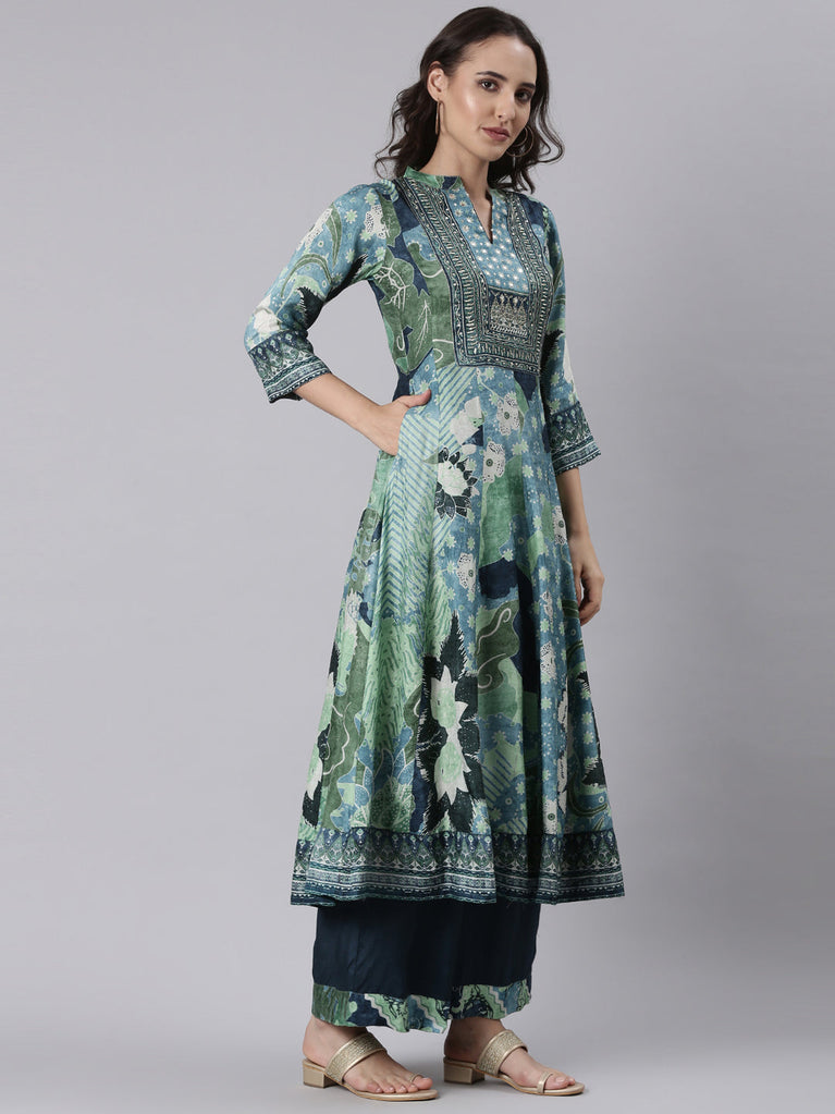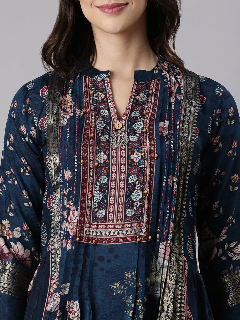 Embrace elegance with this blue silk printed anarkali paired with matching palazzo pants in a graceful three-piece set. The flowing anarkali enhances your silhouette while the comfortable palazzo adds ease to your movement. Perfect for festive occasions, this set combines traditional charm with modern comfort, making you feel confident and radiant wherever you go.