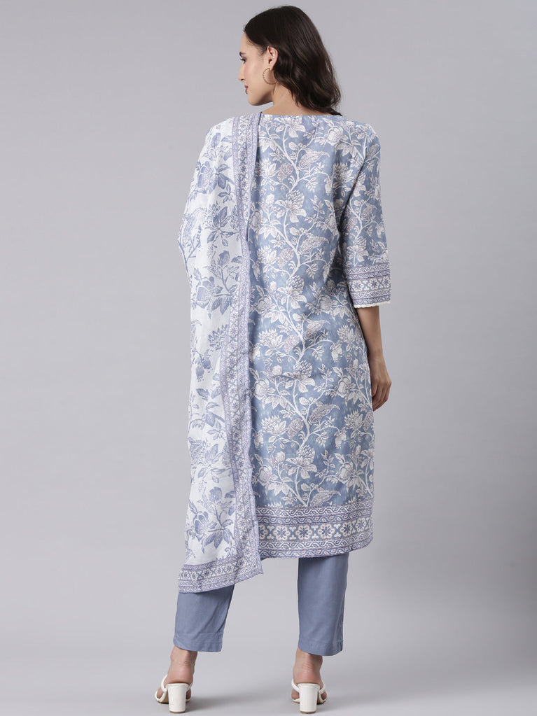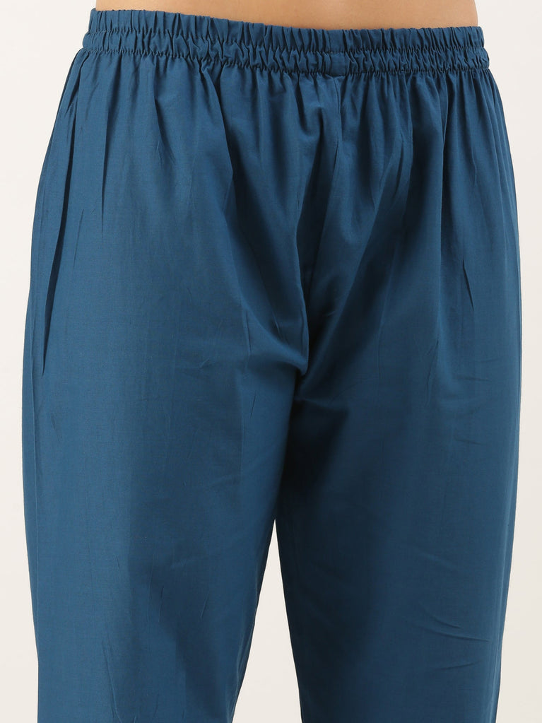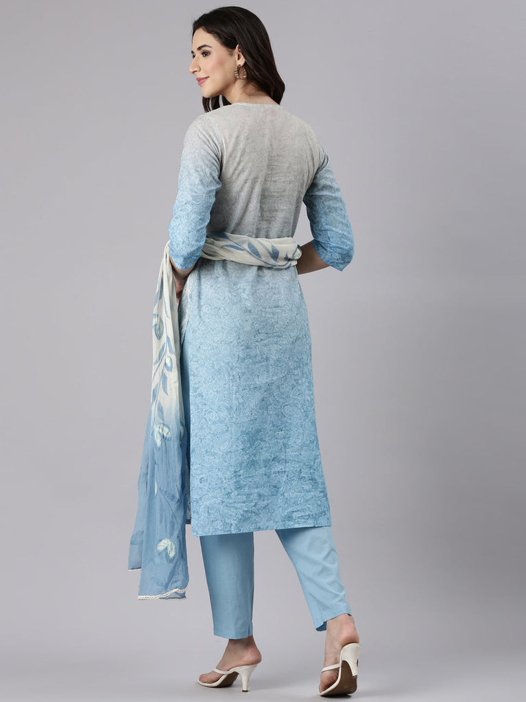 Experience timeless elegance with this Blue Cotton Chikan Work Three Piece Set. Crafted from breathable cotton, it features delicate hand-embroidered Chikan motifs that add subtle sophistication. Perfectly suited for both casual and formal occasions, this set blends comfort with refined craftsmanship.