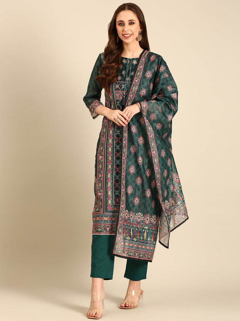 Elevate your wardrobe with this bottle green silk Anarkali three-piece suit set, exquisitely embroidered to perfection. The rich silk fabric offers a graceful drape, while intricate embroidery enhances its timeless charm. Ideal for special occasions, this ensemble combines traditional elegance with luxurious comfort, ensuring you make a refined statement wherever you go.