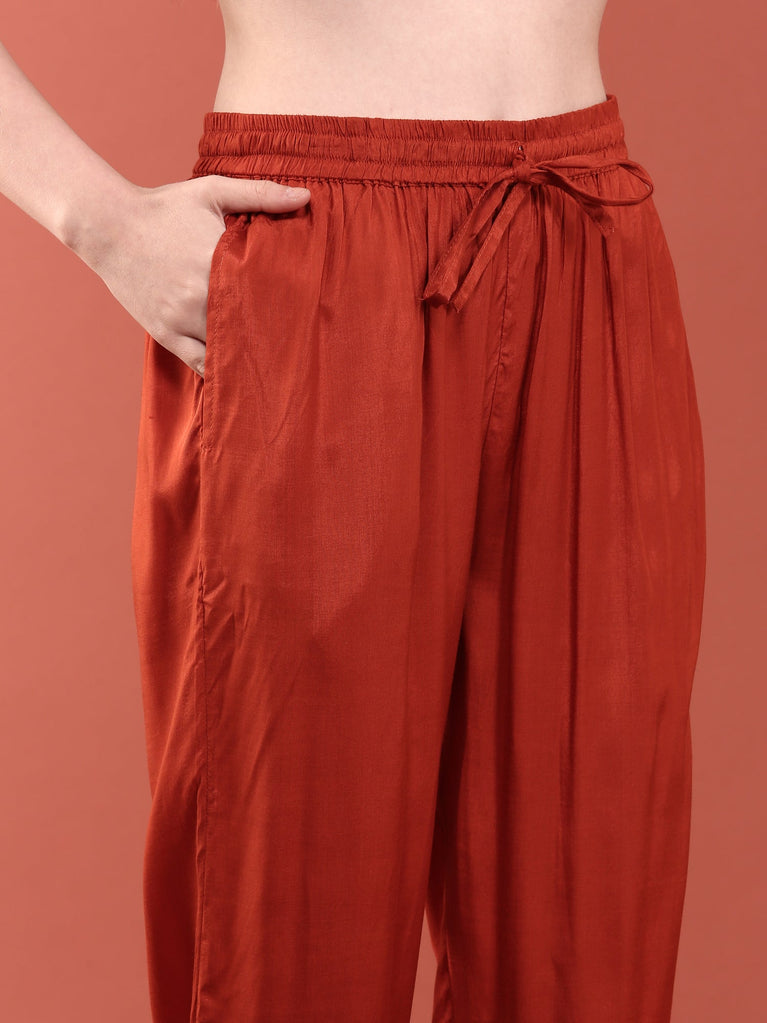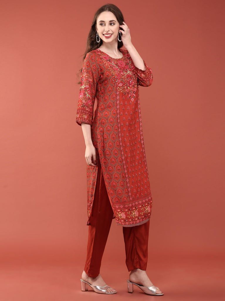 Elevate your ethnic wardrobe with this striking three-piece ensemble crafted from premium dola silk. The blunt orange hue creates a bold, sophisticated statement, while the digital print adds contemporary flair to traditional silhouettes. This versatile set seamlessly transitions from festive occasions to everyday elegance, offering comfort without compromising on style.