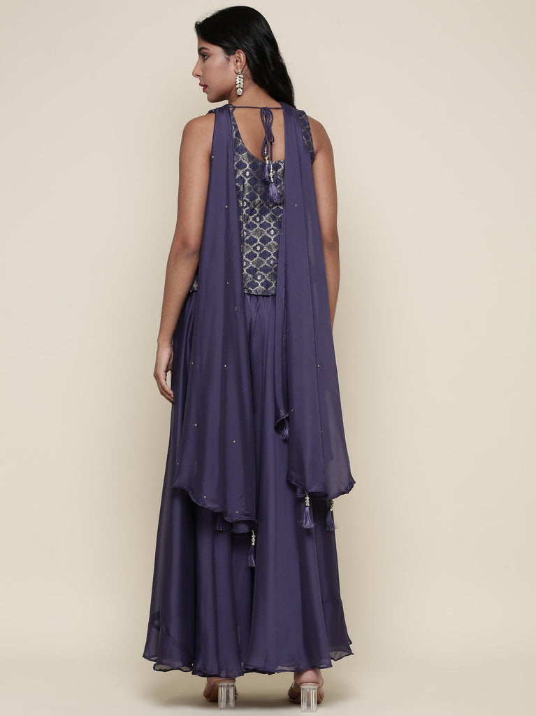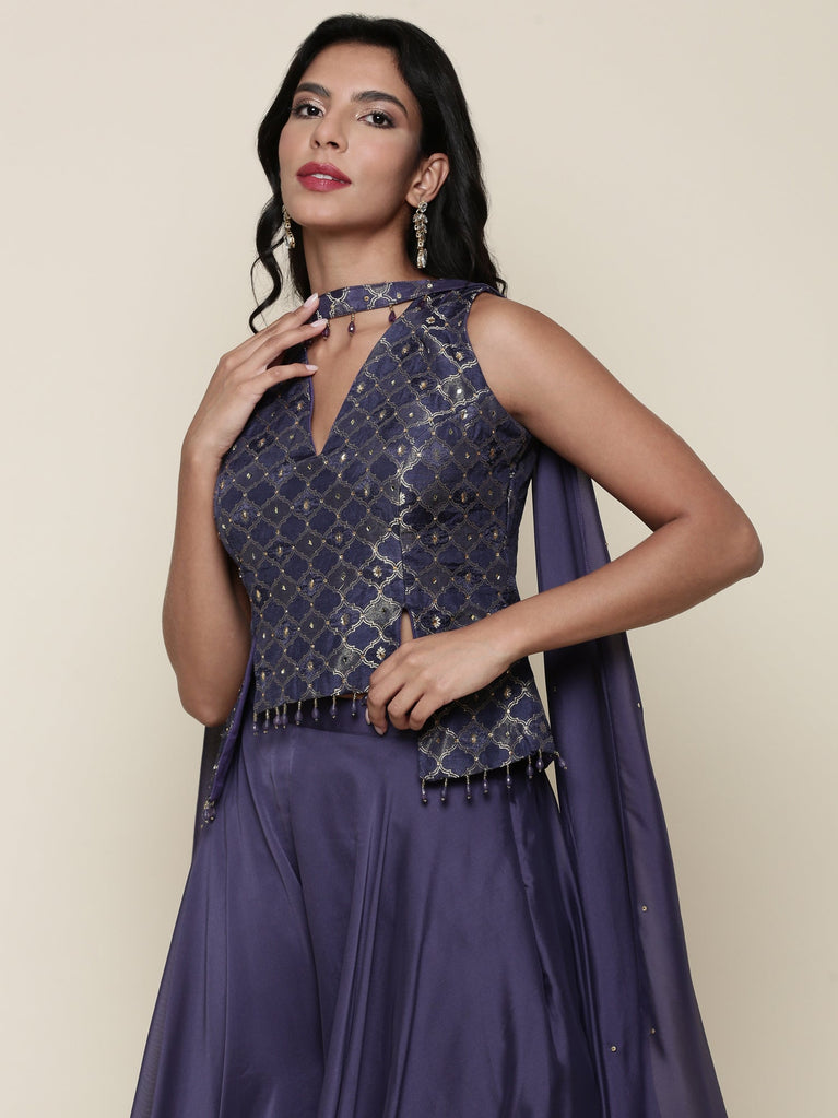 Elevate your style with this Blue Tissue Crop Top and Palazzo Three-Piece Set. Crafted from lightweight tissue fabric, it offers breathable comfort and a graceful drape. The crop top pairs seamlessly with flowing palazzo pants and a matching dupatta, creating a coordinated look perfect for festive occasions or casual outings. Enjoy effortless elegance and freedom of movement while making a bold fashion statement.