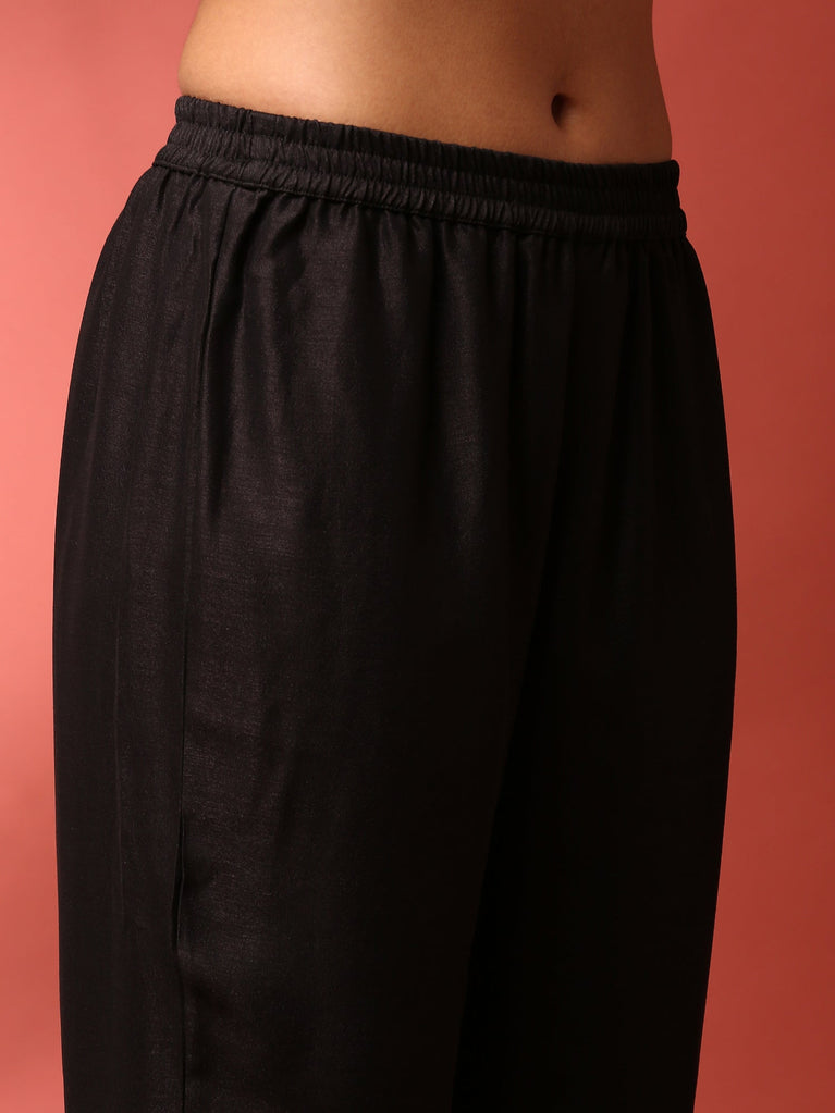 Elevate your ethnic wardrobe with this stunning black silk ensemble that seamlessly blends tradition with contemporary style. The intricately embroidered crop top features elaborate detailing that catches light beautifully, while the flowing palazzo pants offer comfort without compromising on elegance. Perfect for festive occasions, weddings, or upscale gatherings, this two-piece set delivers sophisticated sophistication. The luxurious silk fabric drapes gracefully against your skin, ensuring you feel as refined as you look. Make a lasting impression with this versatile piece that transforms any celebration into a fashion moment.