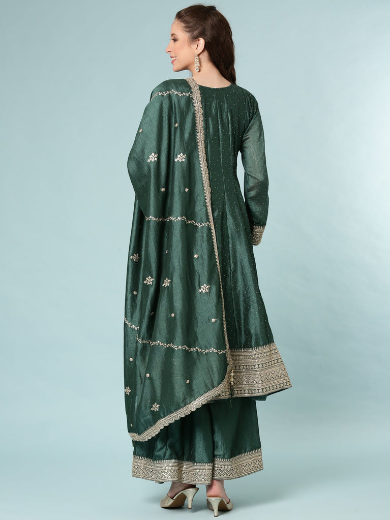Elevate your ethnic wardrobe with this exquisite green silk Anarkali set, a timeless piece that seamlessly blends traditional craftsmanship with contemporary elegance. Crafted from premium silk fabric, this ensemble features intricate embroidery work that showcases meticulous artistry and attention to detail. Perfect for weddings, festivals, or special gatherings, this set combines comfort with sophistication, making it an investment piece for your traditional collection.