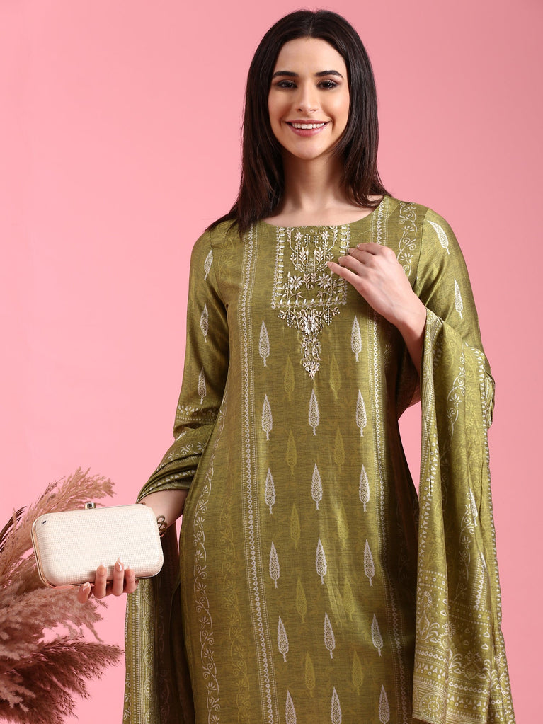 Green Tissue Printed Embroidery Three Piece Suit Set