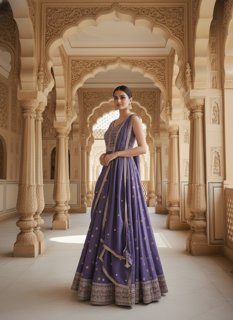 Elevate your ethnic wardrobe with this exquisite Lavender Banaras Silk Anarkali Set, a timeless piece that seamlessly blends traditional craftsmanship with contemporary elegance. Crafted from premium Banaras silk, this set features the iconic Anarkali silhouette with its gracefully flared hemline, offering both comfort and sophistication. The lavender hue provides a refined, versatile option suitable for festive occasions, celebrations, and formal gatherings. Intricate traditional weaving techniques showcase the richness of authentic Indian textile heritage. Perfect for those who appreciate quality fabrics and classic designs that transcend seasonal trends.