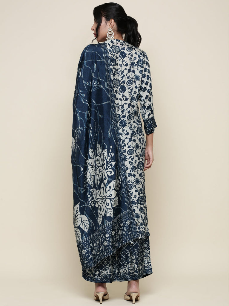 Indigo Blue Modal Silk Floral Digital Print Three Piece Set