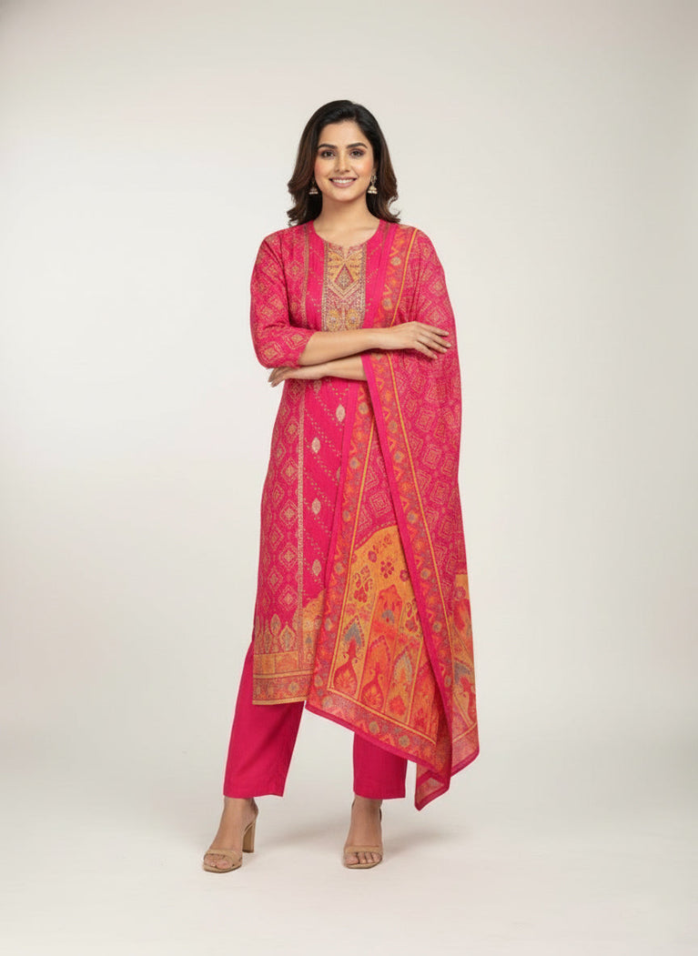 Experience timeless elegance with the Magenta Muslin Bandhani Printed Three Piece Suit Set. Crafted from soft muslin fabric, this set features traditional Bandhani print that adds vibrant charm and cultural richness. The lightweight material ensures comfort and breathability, making it ideal for all-day wear. Perfectly coordinated, the three pieces allow versatile styling for festive occasions or casual gatherings. Elevate your ethnic wardrobe with this expert-crafted ensemble that blends classic artistry with contemporary comfort.