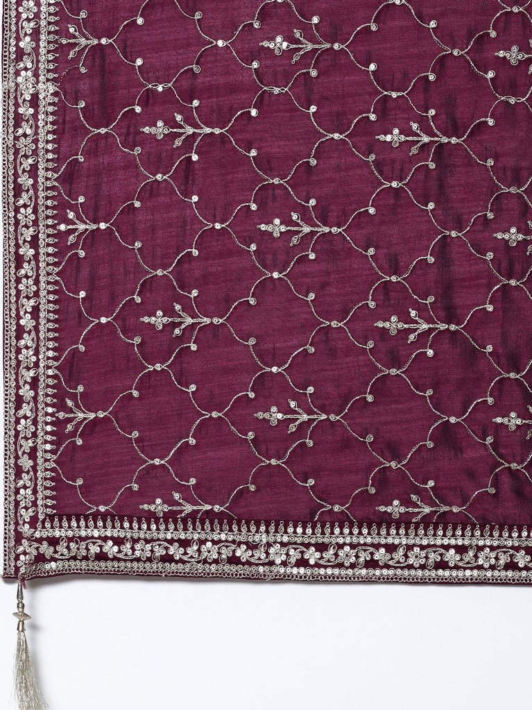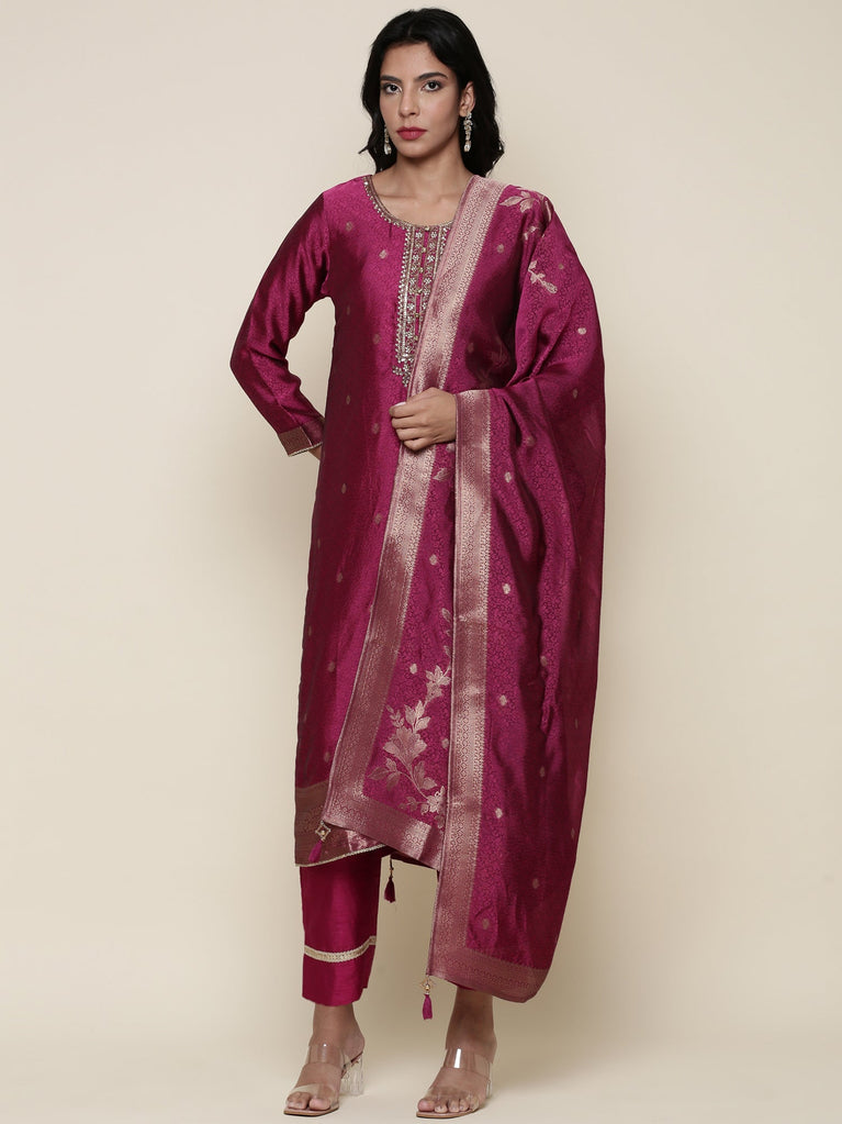 Magenta silk embroidered Three piece set with contrast dupatta