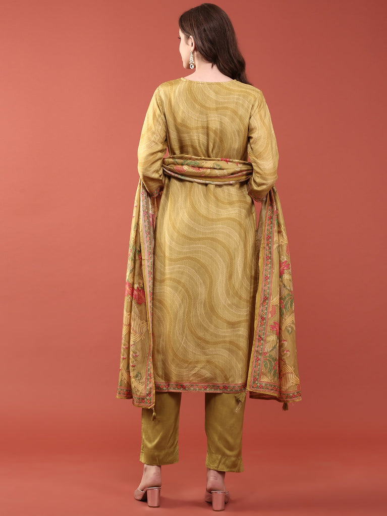 Elevate your ethnic wardrobe with this striking lime green three-piece ensemble crafted from premium dola silk. The digital print technique delivers vibrant, intricate patterns with exceptional color precision and durability. This versatile set combines traditional silhouette with contemporary design, making it ideal for festive occasions, celebrations, or refined everyday wear.