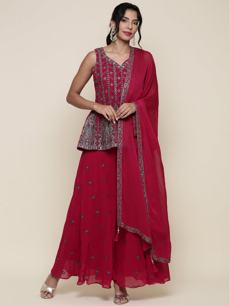 Magenta georgette embroidered peplum and palazoo Three piece set