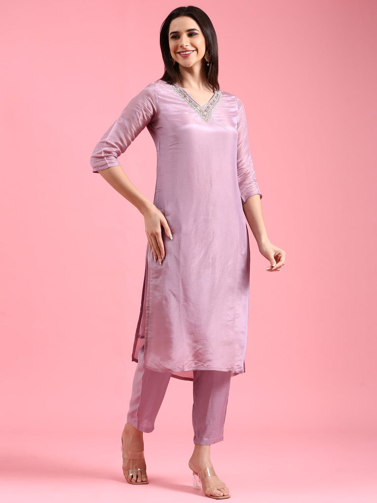 Lilac Tissue Hand Embroidery Three Piece Suit Set